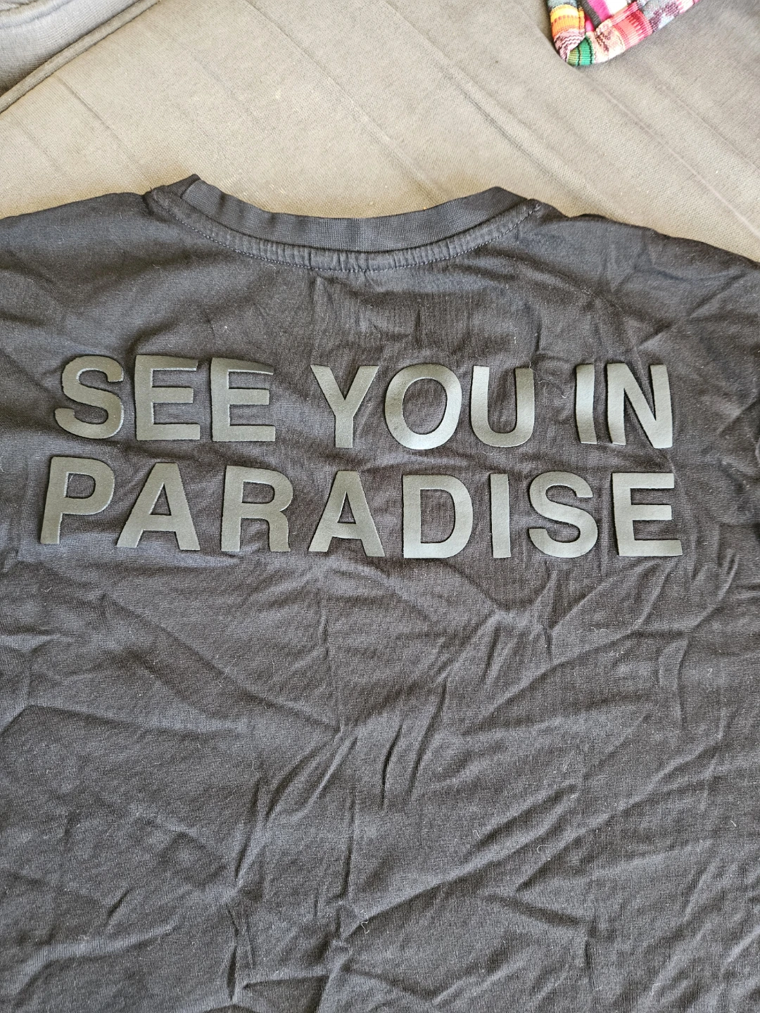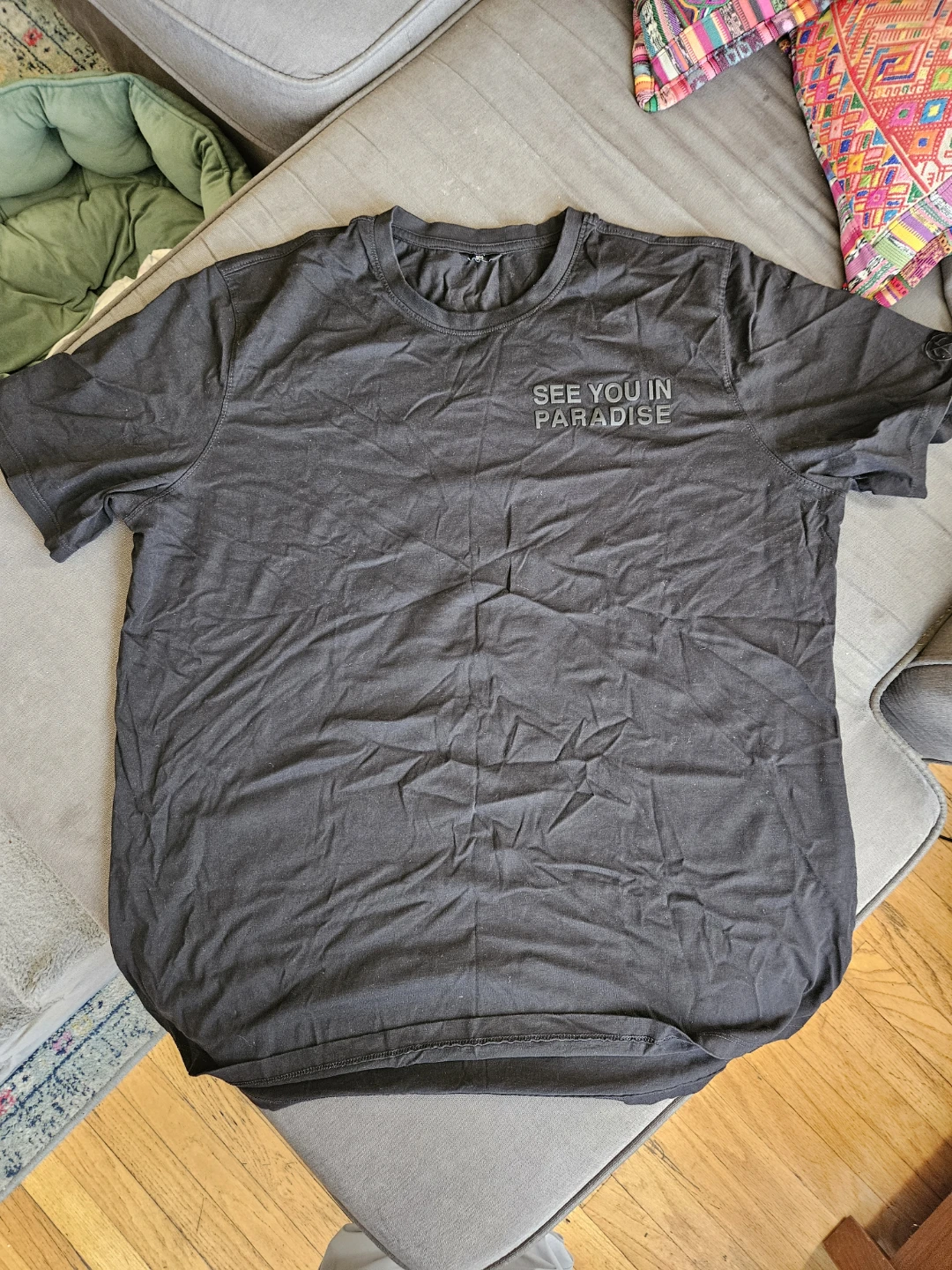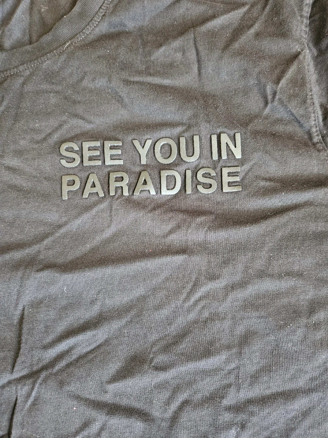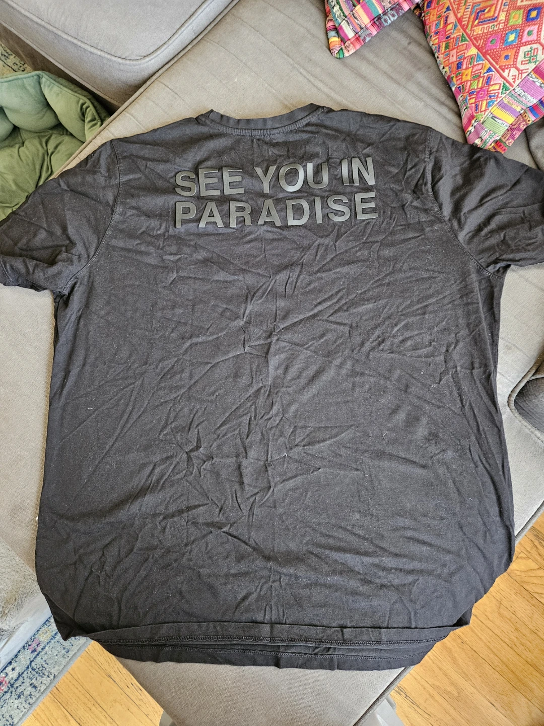 Black t-shirt with "See You In Paradise" graphic on the front and back. Size is 3XL. Cotton material. Measurements W22xL31.