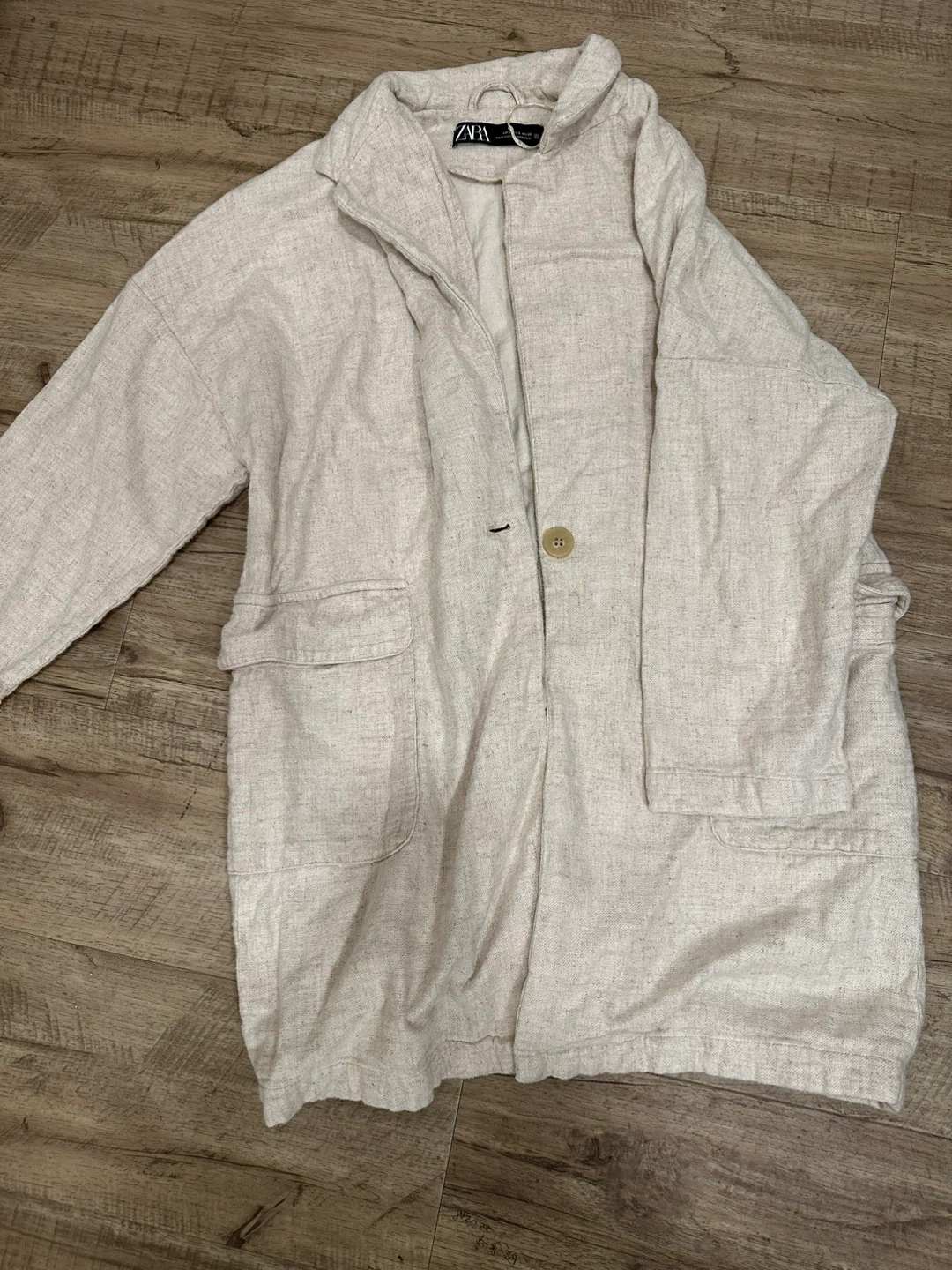A Zara linen blend blazer in a neutral beige colour. It features a single button closure and two front pockets. This blazer is perfect for layering.
