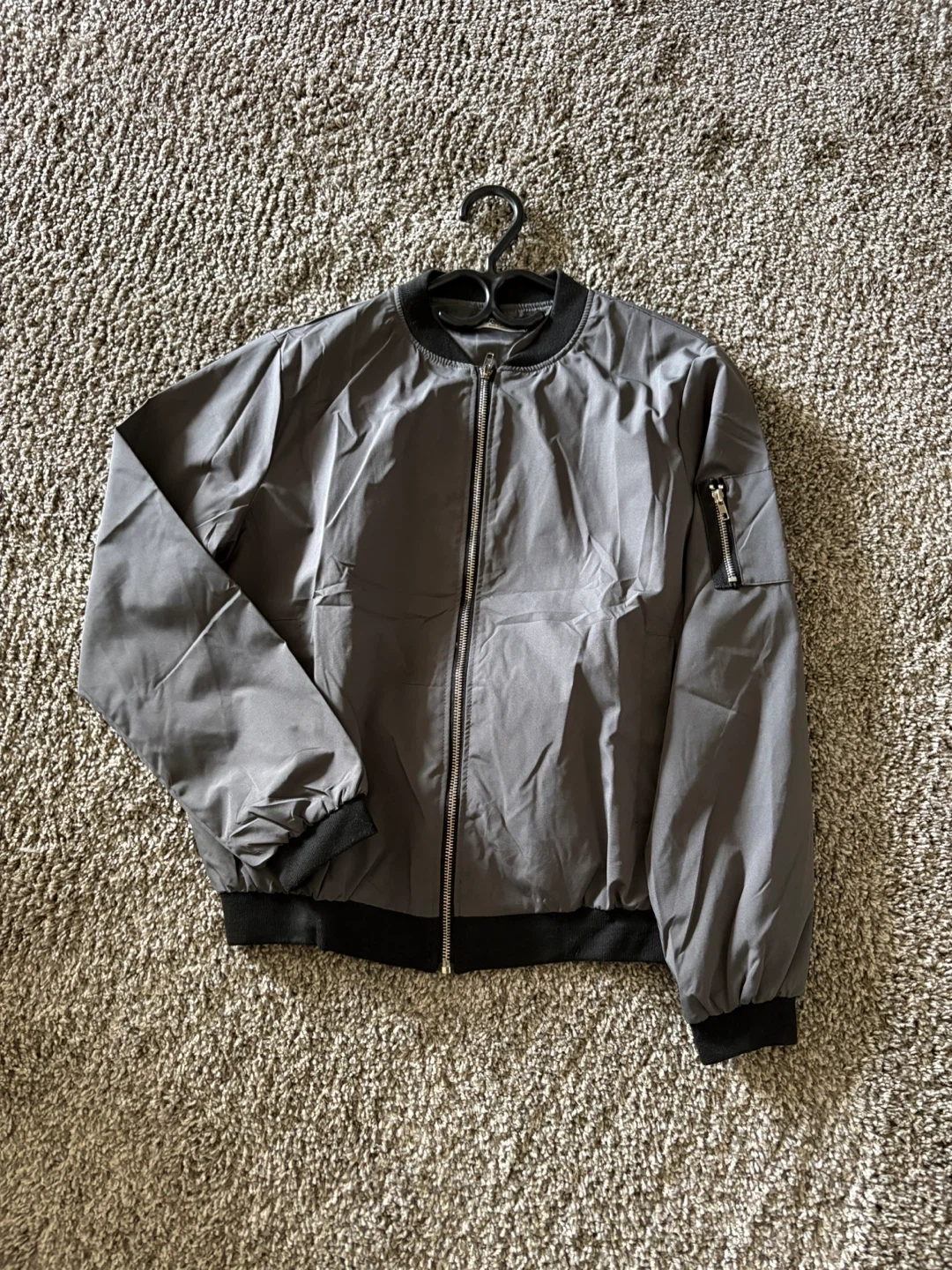 A grey bomber jacket with a black collar, cuffs, and hem. It features a full zip front and a zip pocket on the left sleeve. This jacket is made of a lightweight material, perfect for layering.