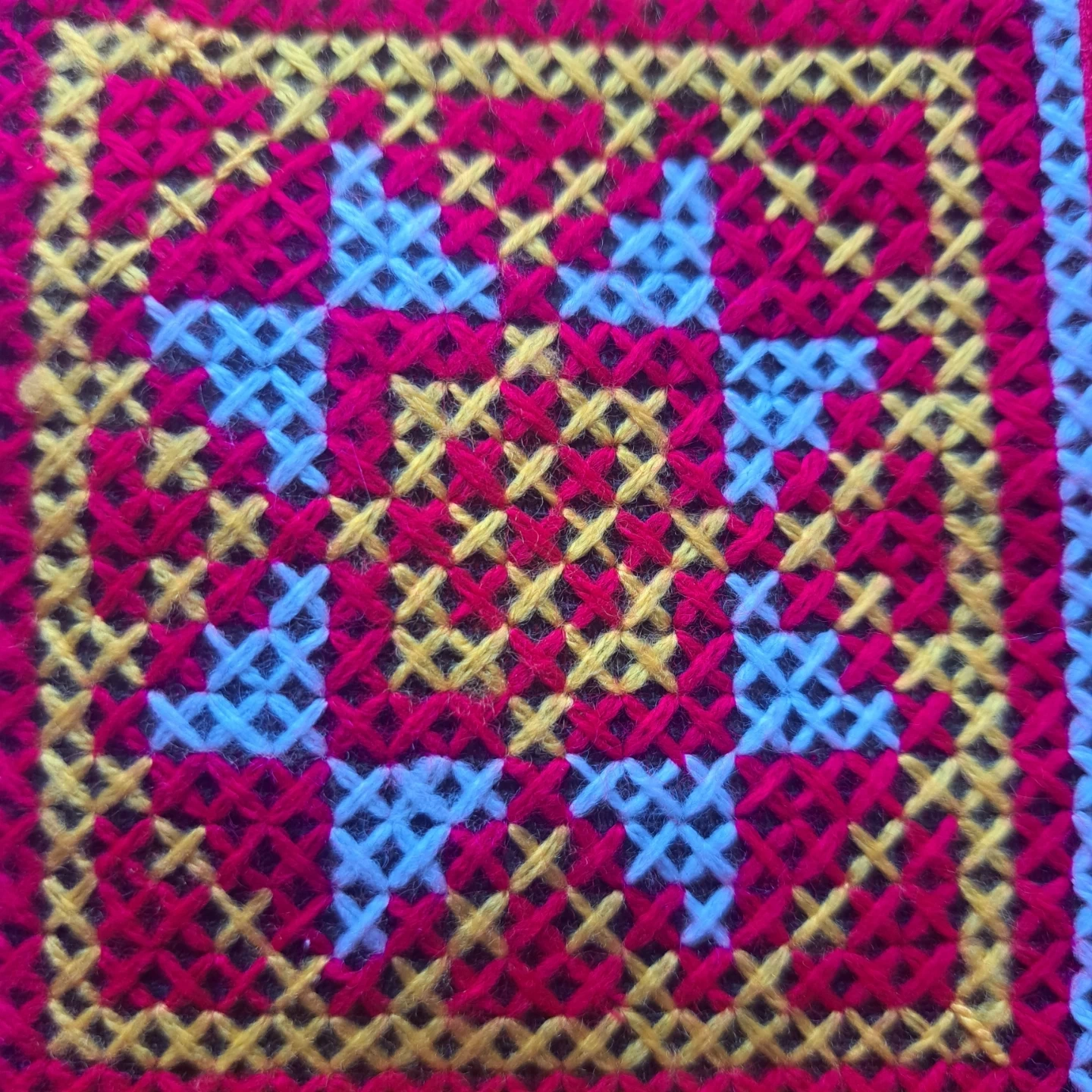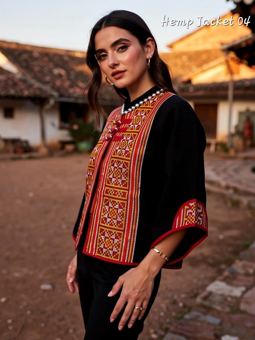 This ethnic-inspired jacket is crafted from natural hemp fiber, featuring intricate geometric embroidery.