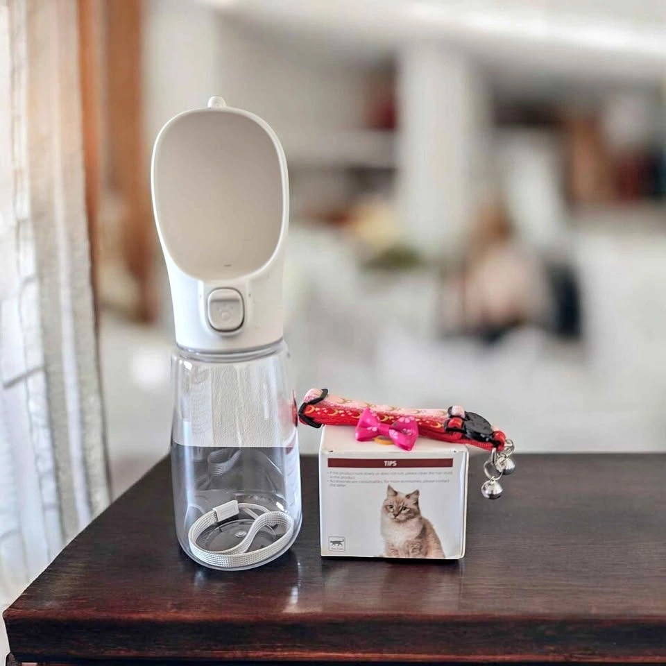Everything you need for a day out with your pet! Brand new and ready for use. Includes: 2-in-1 Travel Bottle (portable water bottle with a built-in drinking bowl), two adjustable patterned collars with cute bells, and a cat toy box with a fun interactive toy. Let me know if you're interested!