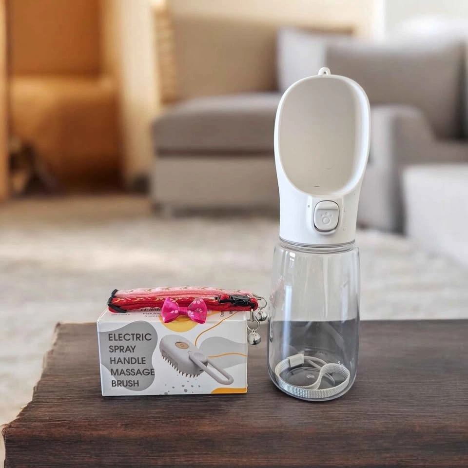 Everything you need for a day out with your pet! Brand new and ready for use. Includes: 2-in-1 Travel Bottle (portable water bottle with a built-in drinking bowl), two adjustable patterned collars with cute bells, and a cat toy box with a fun interactive toy. Let me know if you're interested!