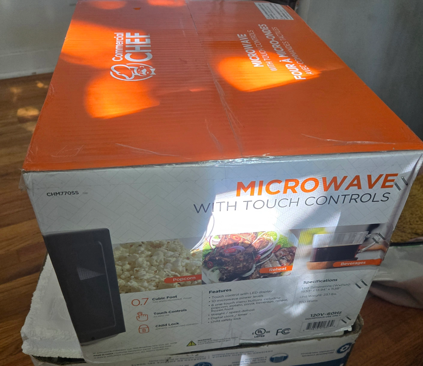 New in box, never used 0.7 Cubic Foot Microwave with touch controls.