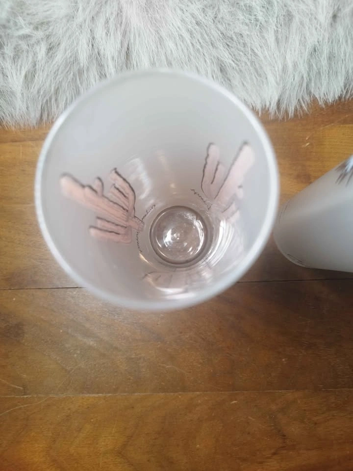Cool set of 2 frosted glasses. One has a cactus design with 'Palm Springs' and the other has a palm tree design with 'California'. Perfect for drinks or just decor. Pick up Stony Plain Spruce Grove area.