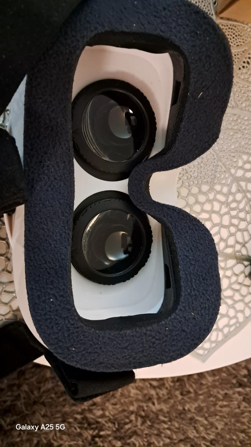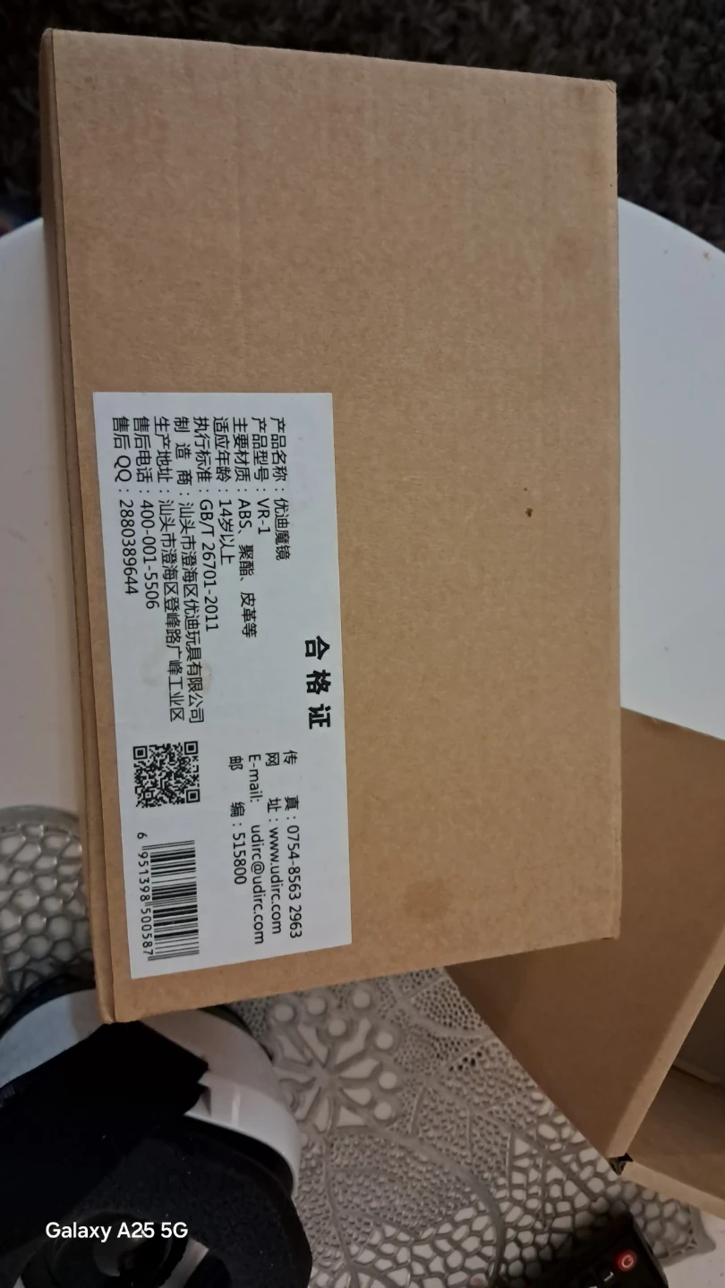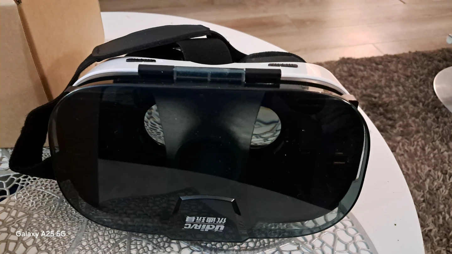 This is a UdirC VR-1 virtual reality headset in black and white. It's made of ABS plastic and has adjustable straps. The recommended age is 10 years and up. It's never used I am moving to my country delivery also available free of coast depend upon distance between 5km