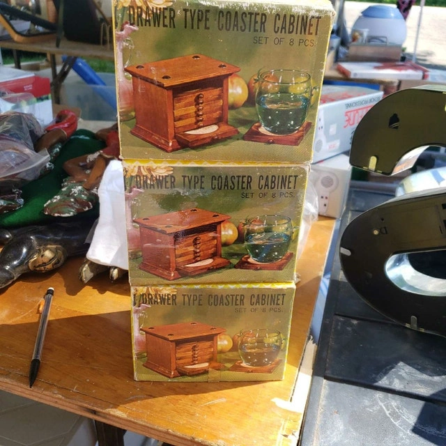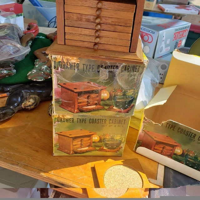 3 new Vintage Wood And Cork Coaster Set In Cabinet. Each coaster is a wood base with a cork inset measuring 3.75” x 3.5”. The rack/holder is all wood and measures 5.25” wide x 3.75” deep x 3.75” tall. Asking $15 each or all 3 sets for $25. PICK UP ON OLD RICHMOND ROAD NEPEAN