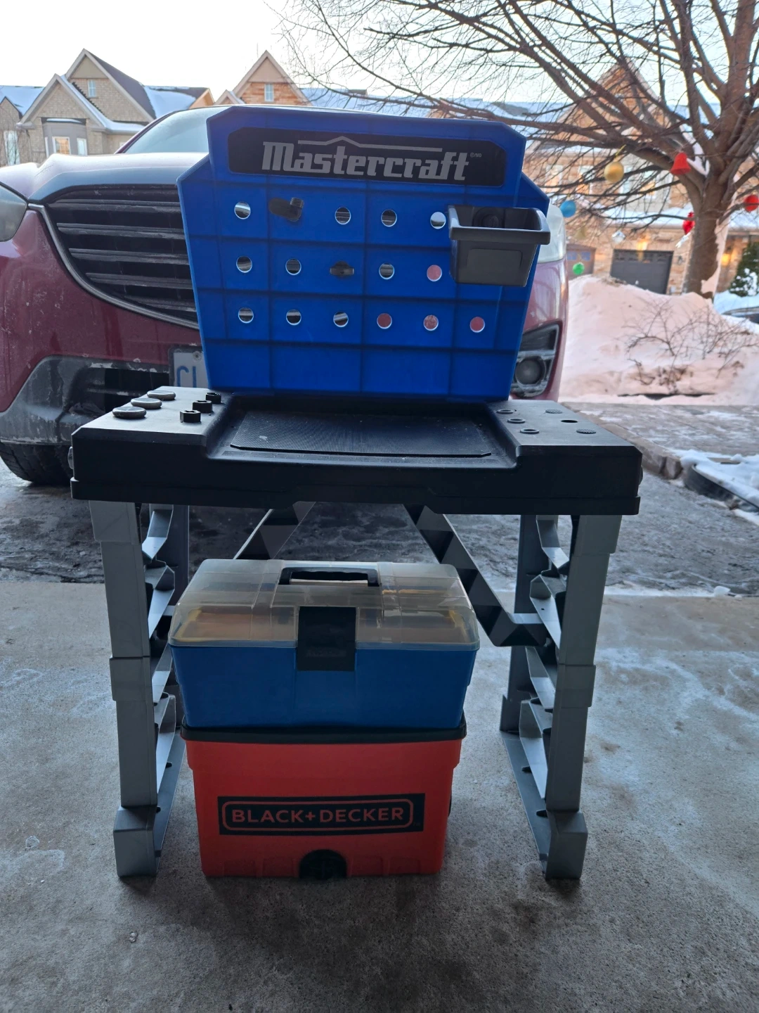 This is a Mastercraft folding workbench, perfect for any small projects or handy tasks. It's made of durable plastic and metal. Below it, you'll find a Black + Decker tool chest for convenient storage. Comes with multiple boxes of kids tools