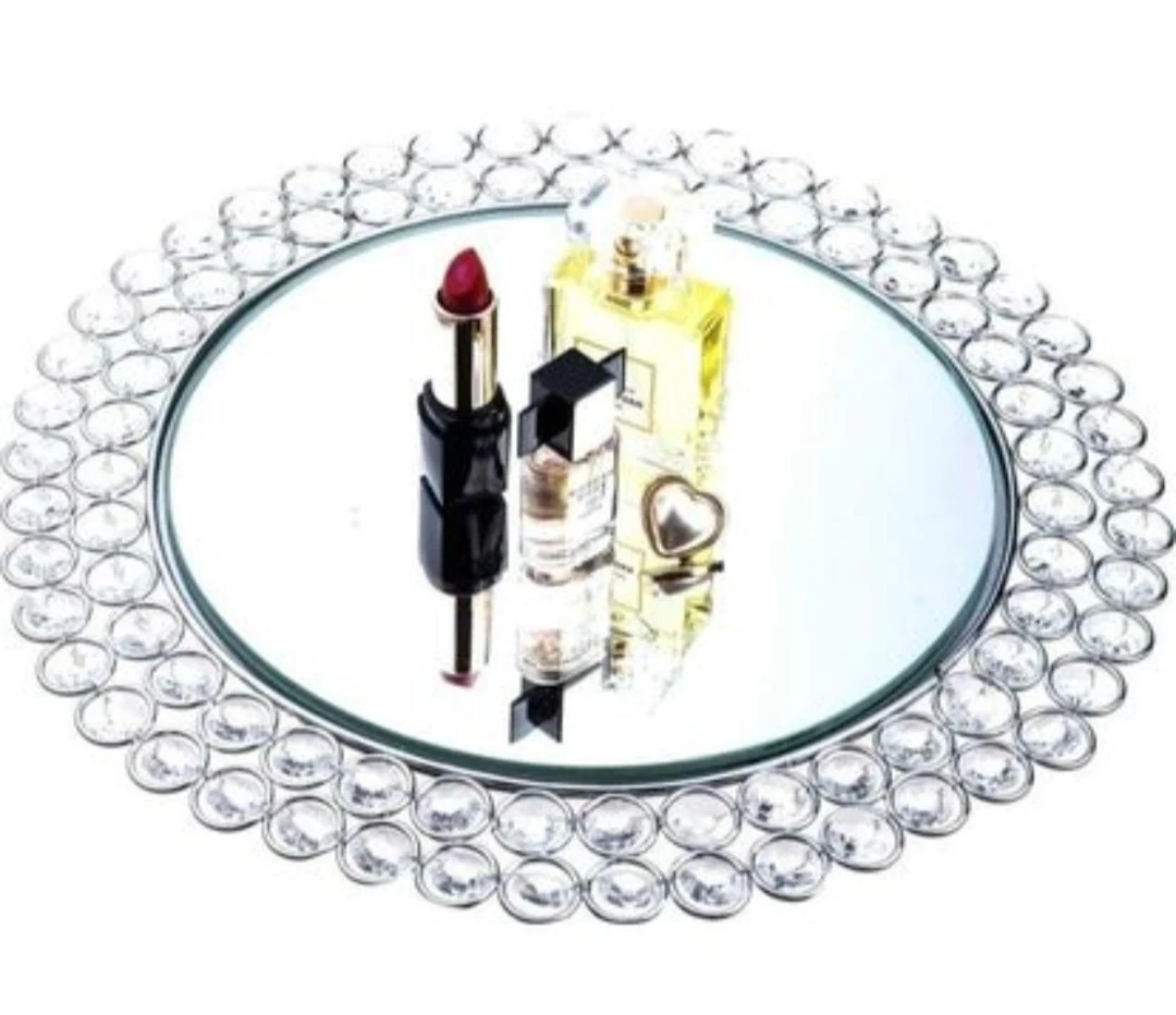 This decorative tray features a mirrored surface surrounded by sparkling crystal beads. It measures 11.8 inches by 8.6 inches. It's perfect for displaying perfumes, makeup, or small decorative items on a vanity or dresser.