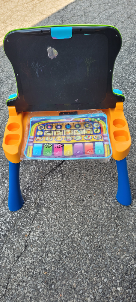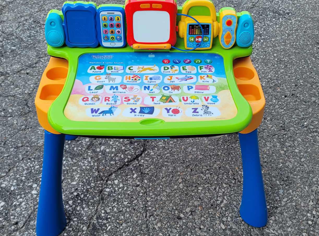 VTech Explore & Write Activity Desk - Orange/green/blue. It has interactive features and sounds. Comes with a few interactive activity panels. In good condition and works.