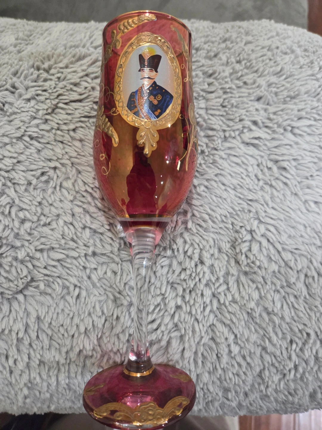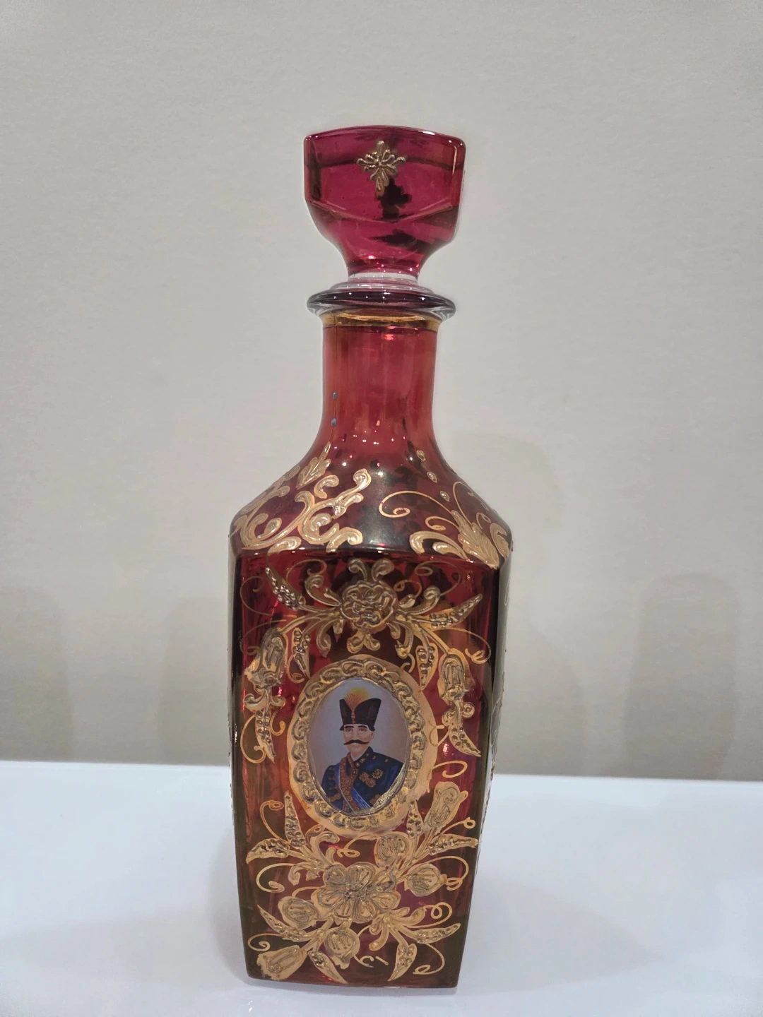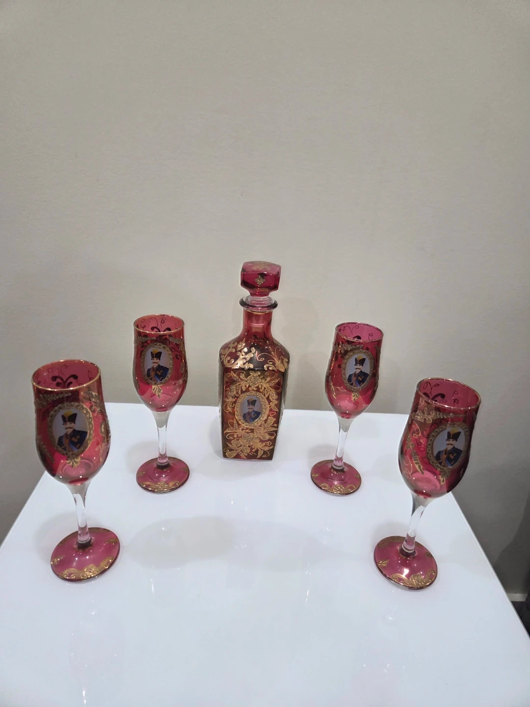 A beautiful ruby-red glass decanter and four matching glasses. Each piece is adorned with intricate gold detailing and a portrait of a distinguished figure. It's perfect for displaying or for special occasions!