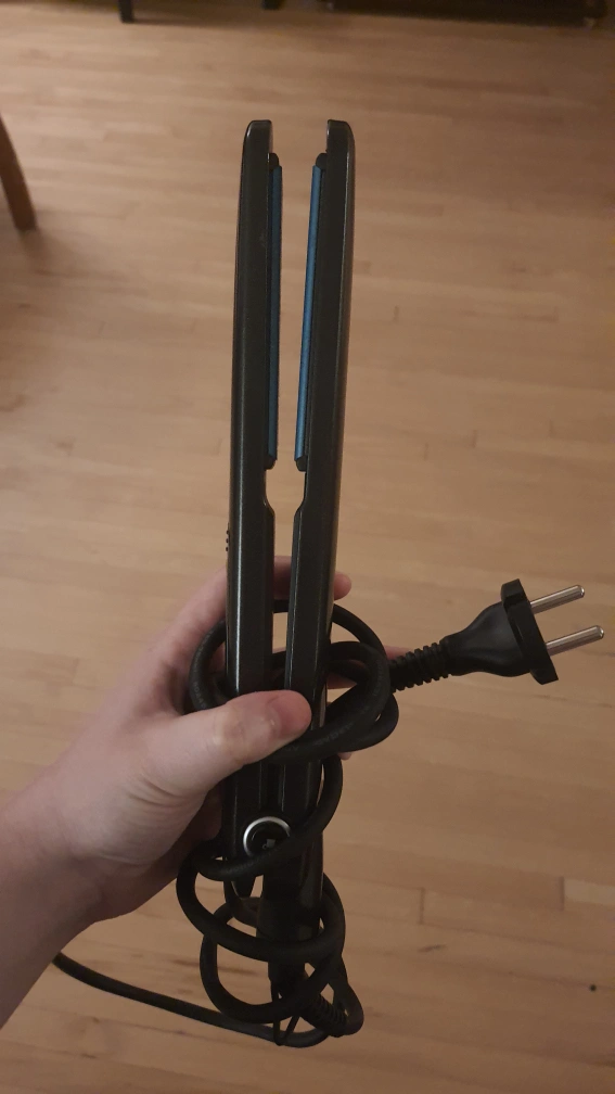 Hair straightener with ceramic plates covered in Keratin. It shows the temperature it reached on the digital screen. It works very well, but I don't have long hair anymore, so I won't use it. It has a European plug, if you don't have an adaptor I can give you one of mine.