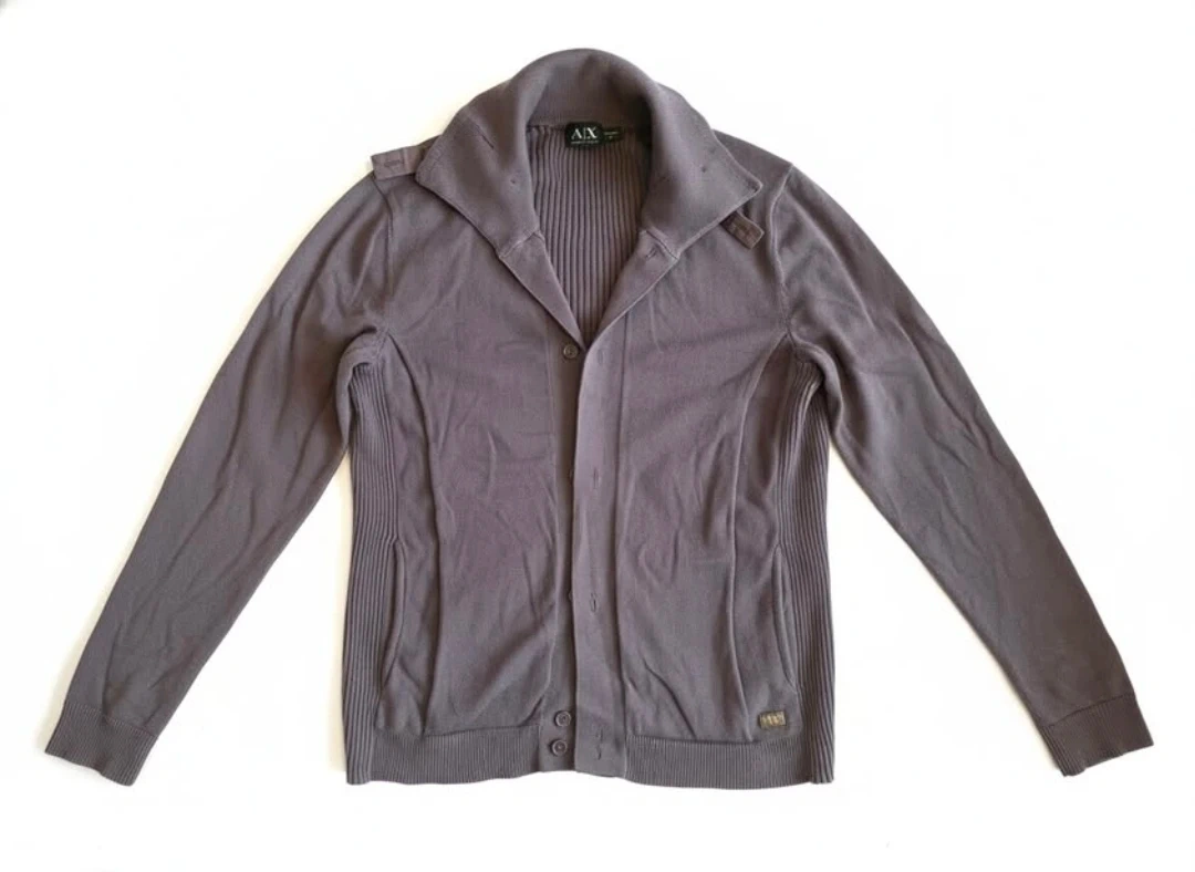 Cool grey ARMANI EXCHANGE cardigan sweater for men. It's a size medium with a button-up front and a classic collar. This knit sweater's ribbed details add a touch of style. Great for layering!