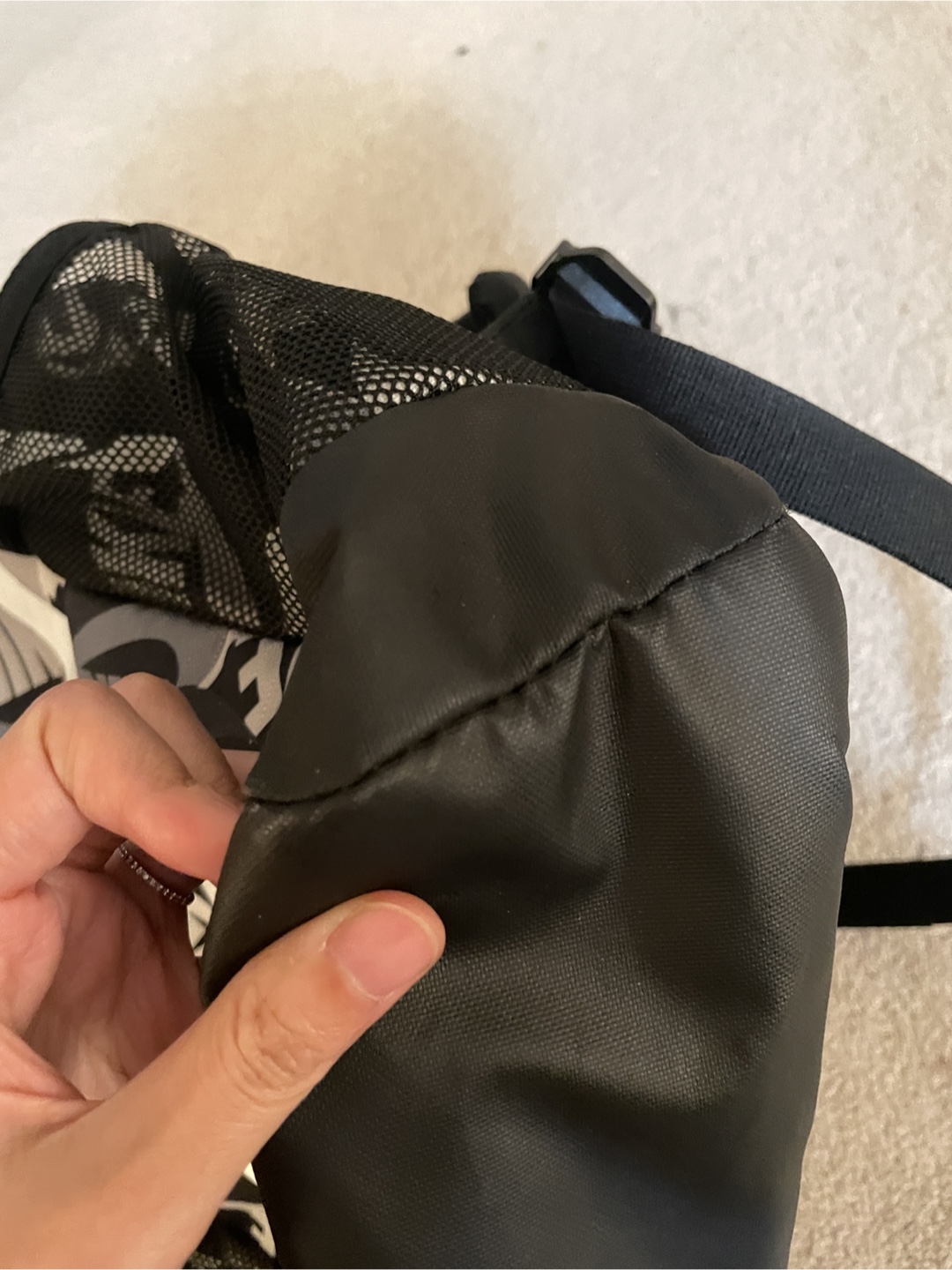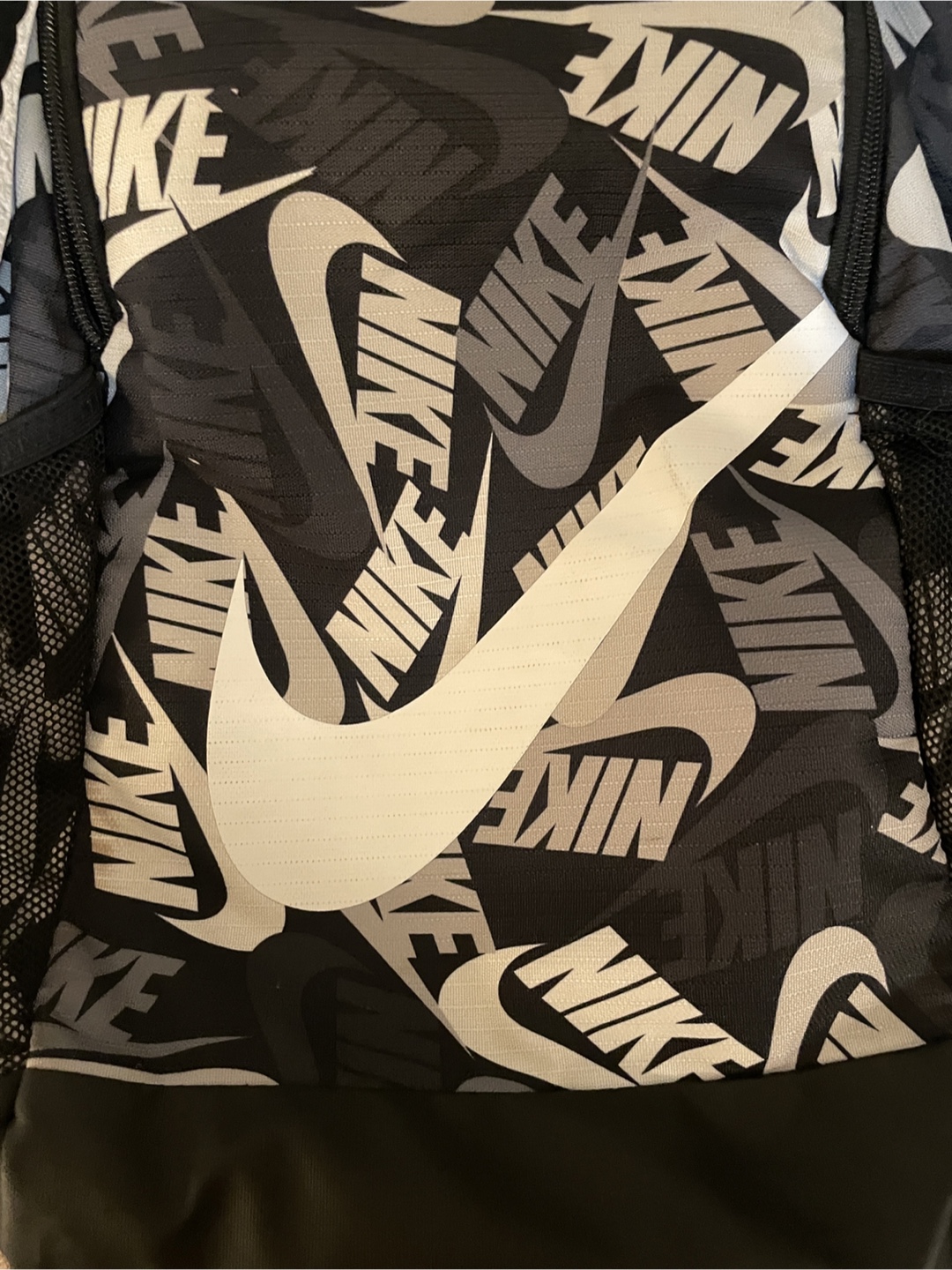 Nike backpack with a black and grey pattern. It features the Nike logo and has side pockets for water bottles or other items. Great for school, sports, or everyday use!