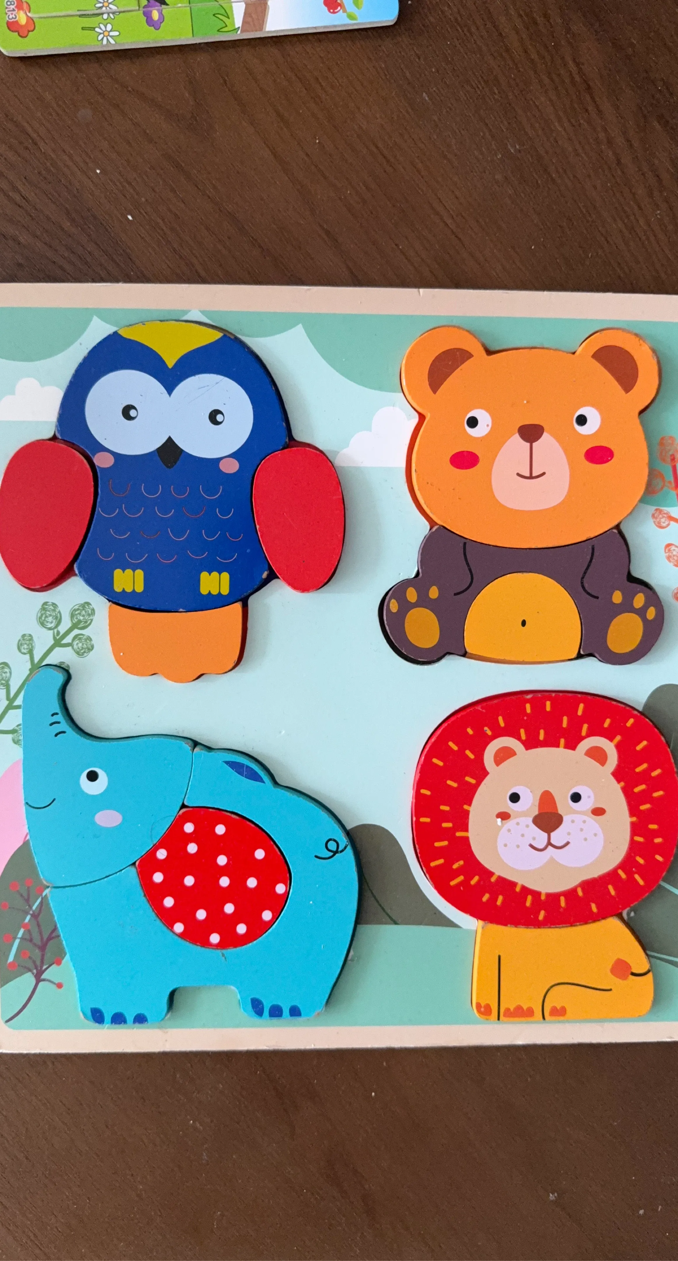 This set includes four chunky wooden puzzle pieces: an owl, a bear, an elephant, and a lion. They're colourful and easy for little hands to grasp. Great for developing fine motor skills! Cash and pick up.