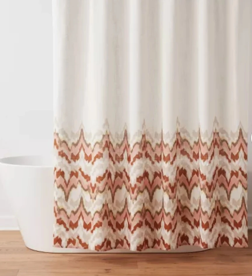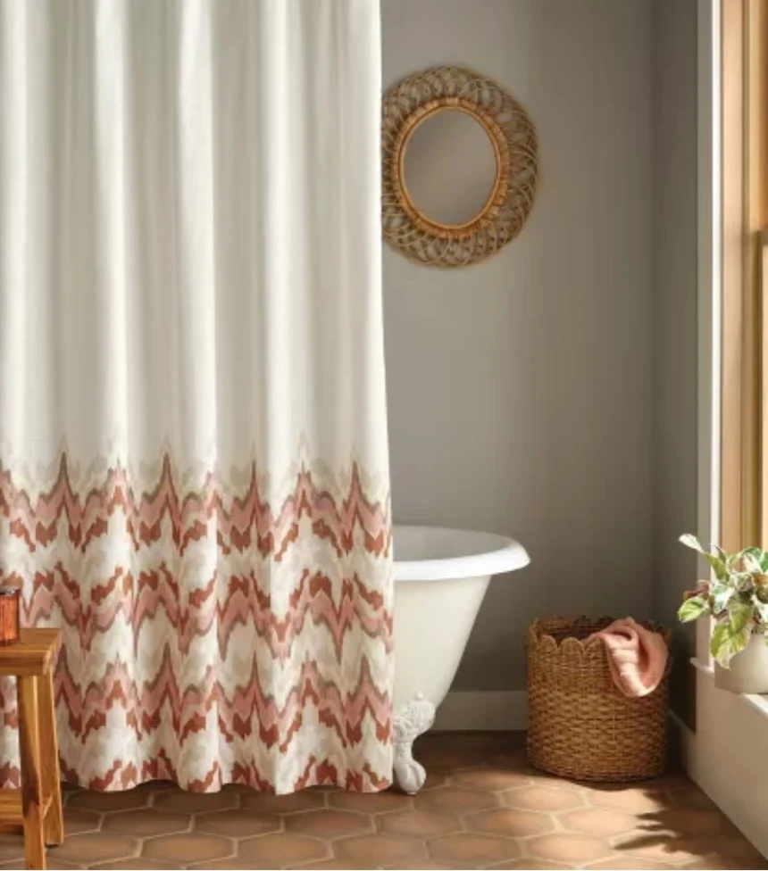 Add a splash of boho charm to your bathroom with this ikat stripe shower curtain. It's made from durable fabric and features a stylish patterned border. Machine washable for easy care!