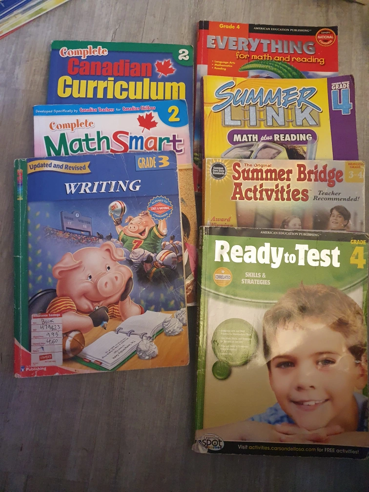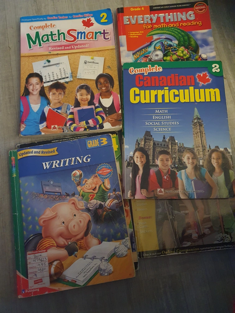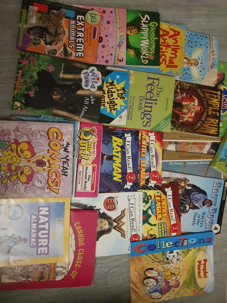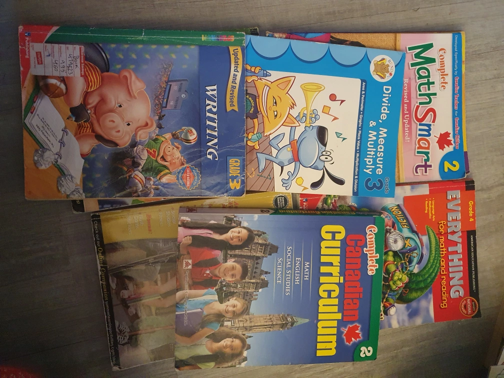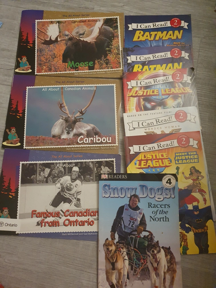 Selling a bundle of educational books for kids! Includes workbooks for writing, math, and general curriculum, as well as early reader books featuring Batman, Wonder Woman, and Canadian animals. few other story books.