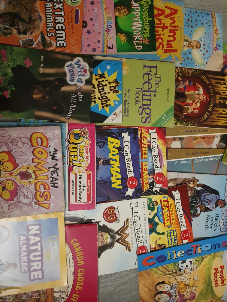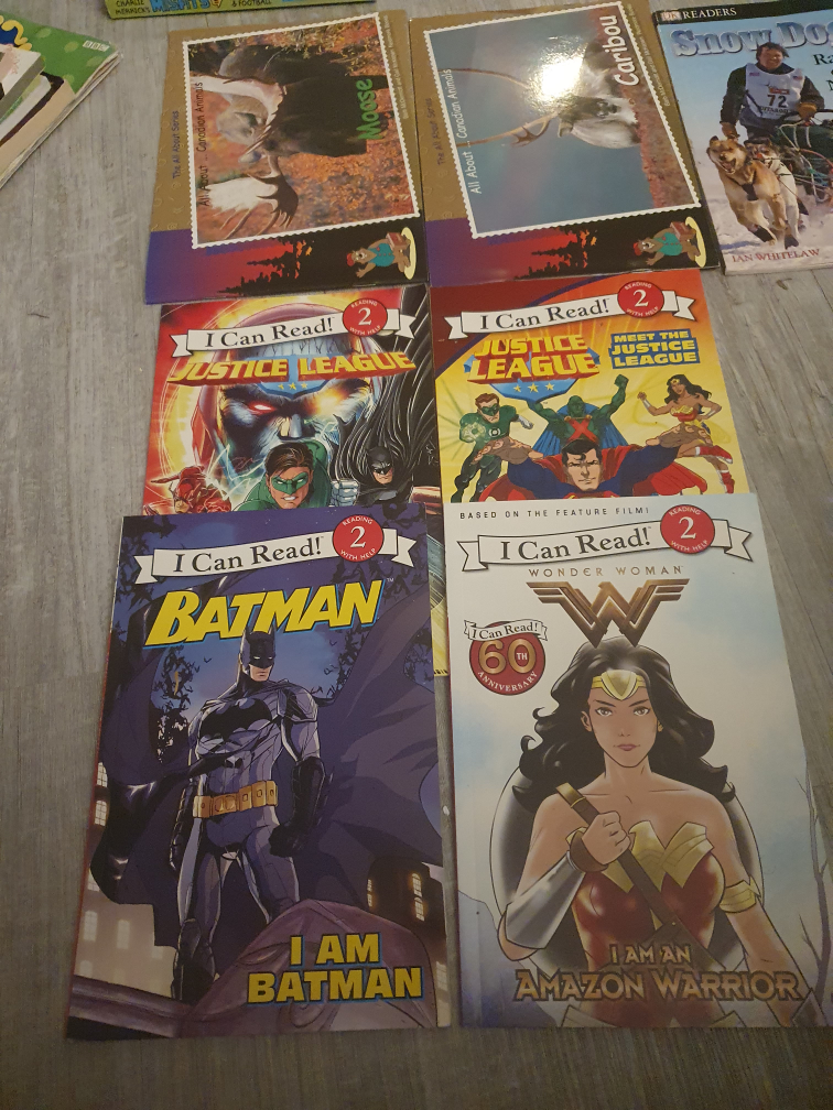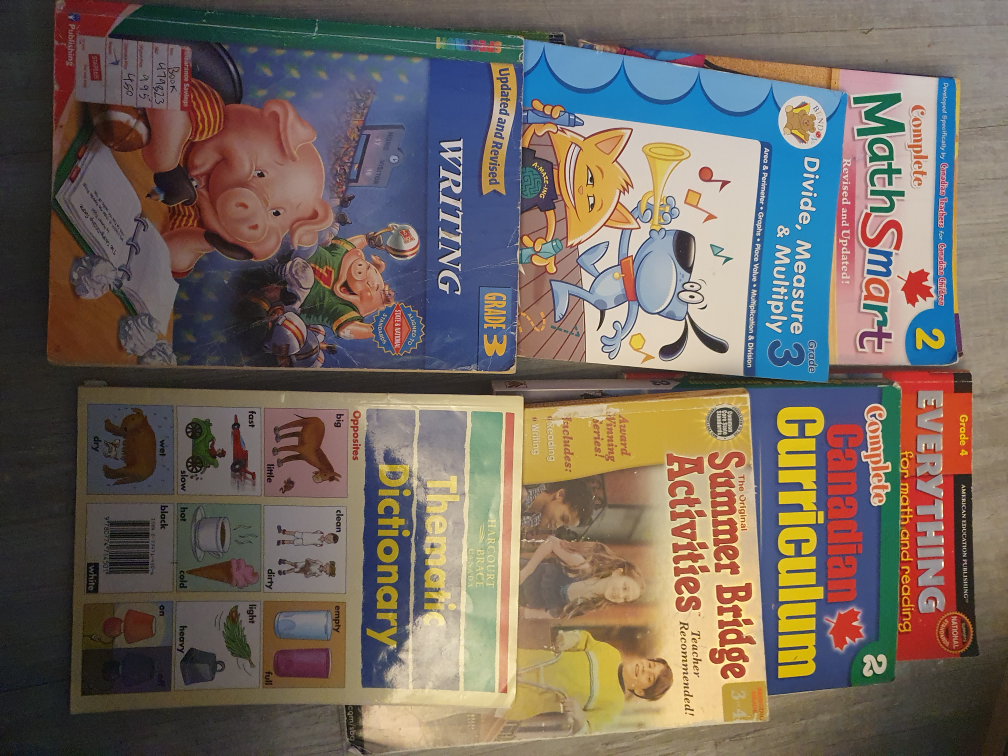 Selling a bundle of educational books for kids! Includes workbooks for writing, math, and general curriculum, as well as early reader books featuring Batman, Wonder Woman, and Canadian animals. few other story books.