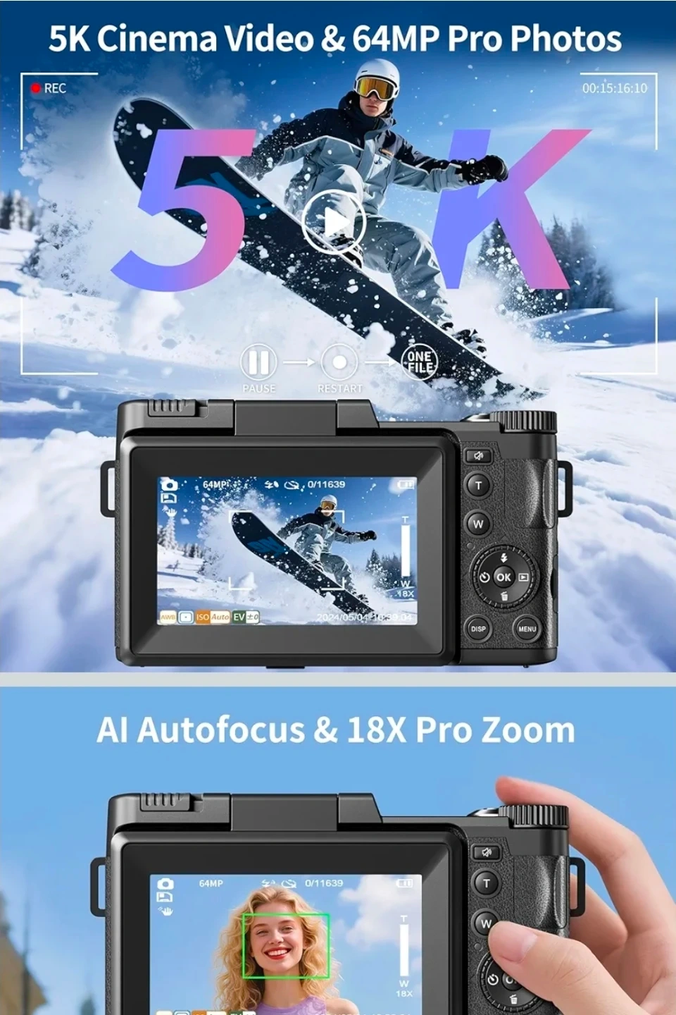 This digital camera shoots 5K cinema video and 64MP pro photos. It features AI autofocus and an 18X pro zoom for getting closer. Includes camera, 64GB card, battery, charging cable, and manual.
