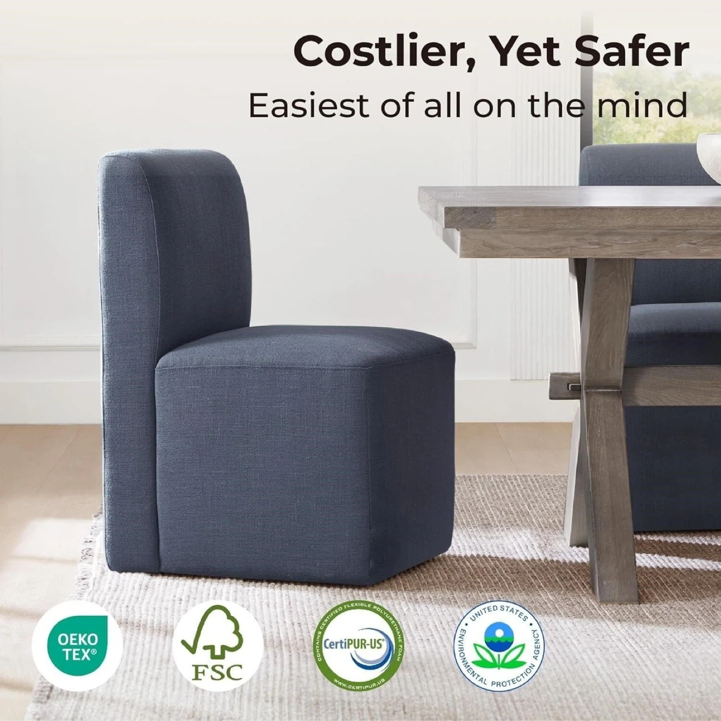 This upholstered accent chair comes in a deep blue fabric. It's designed with hidden casters for effortless mobility. The modern, armless design fits well in various spaces.