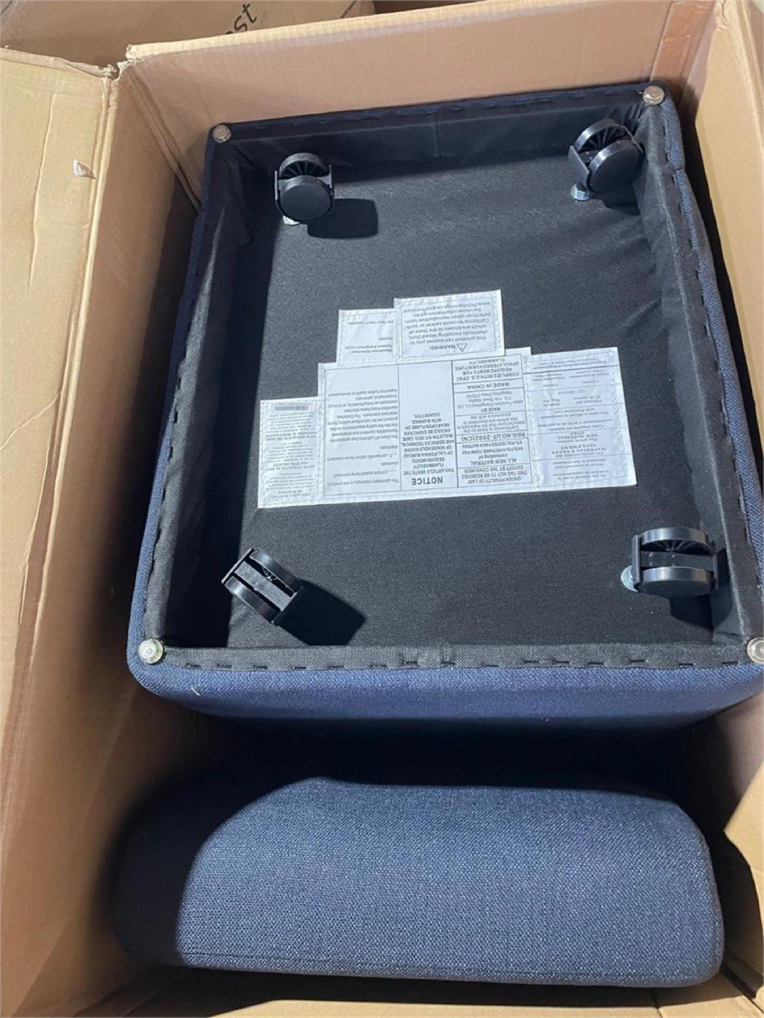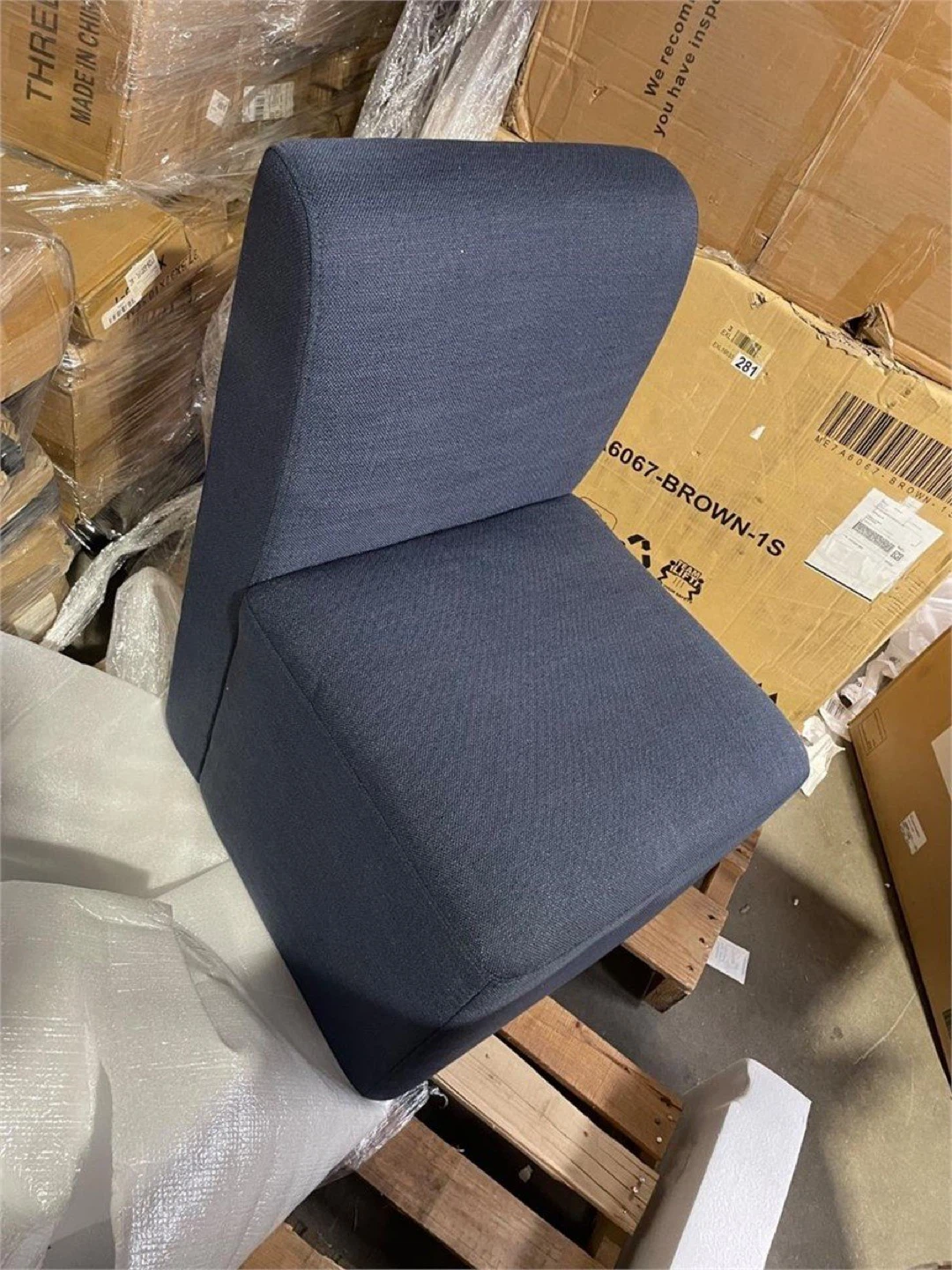 This upholstered accent chair comes in a deep blue fabric. It's designed with hidden casters for effortless mobility. The modern, armless design fits well in various spaces.