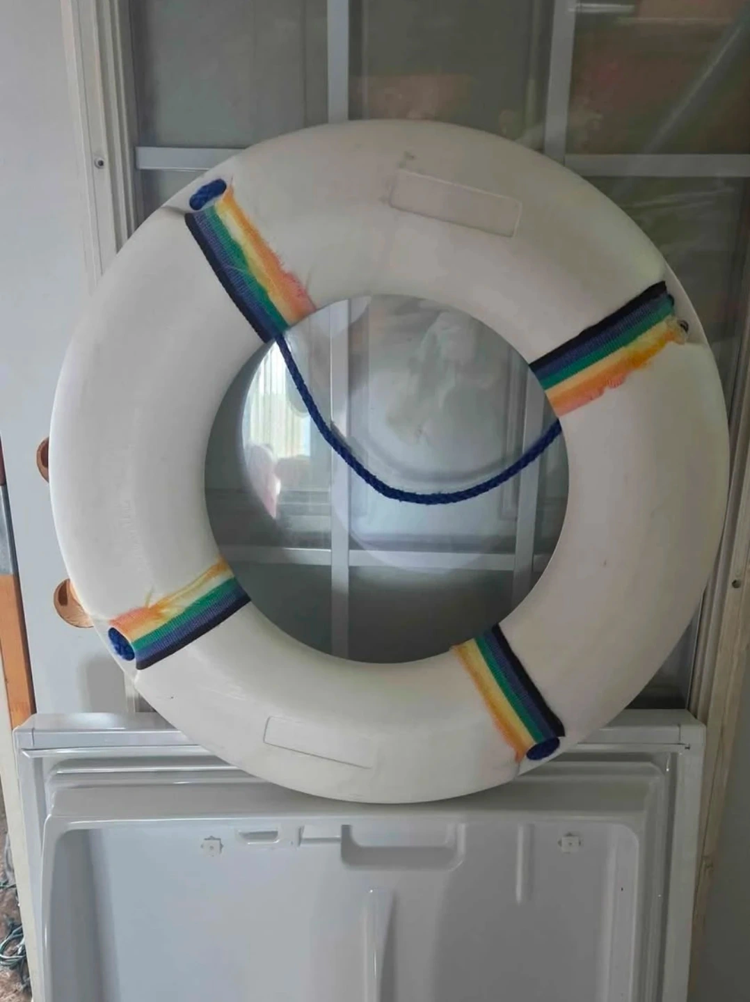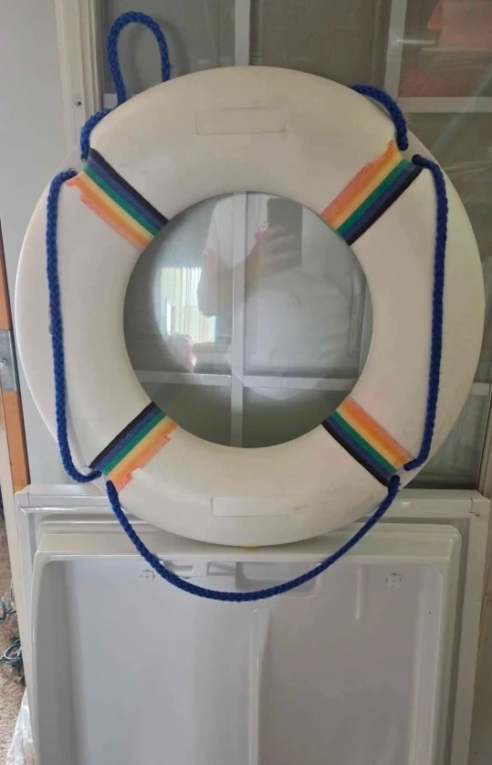Selling a white life preserver. It has some rainbow accents and a blue rope. It's in good condition and ready to keep you safe!