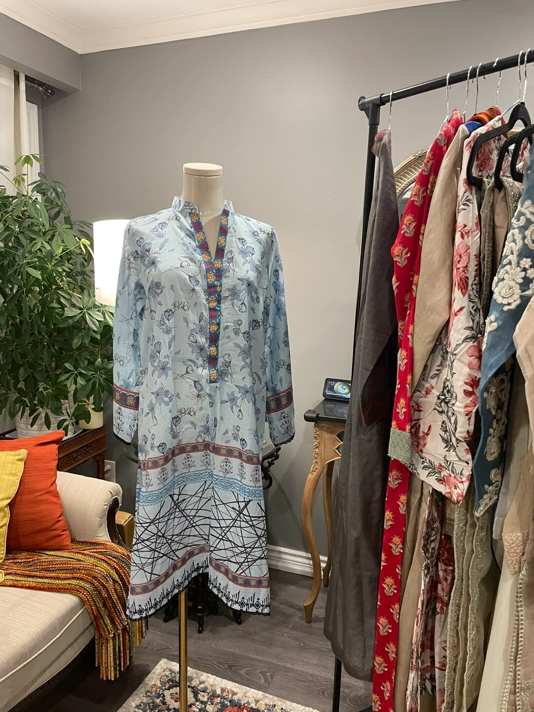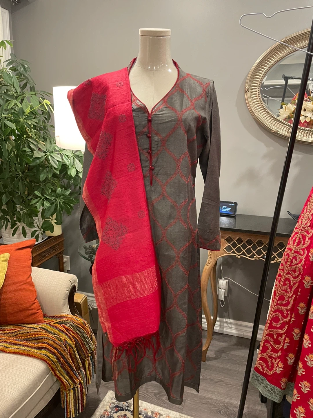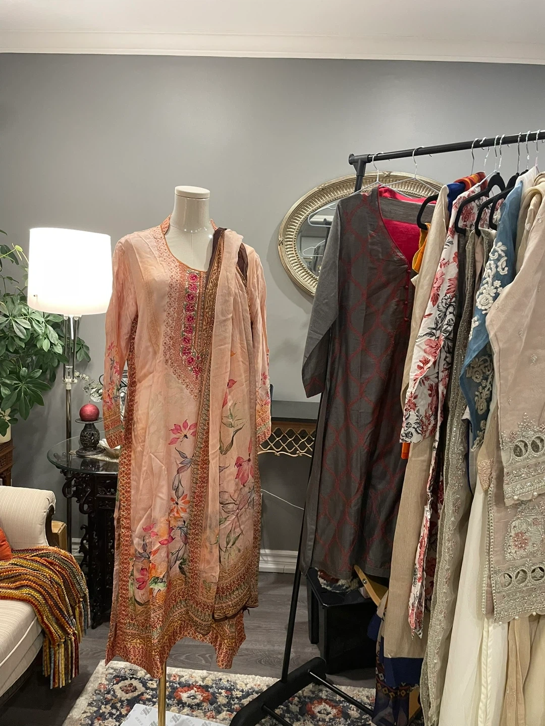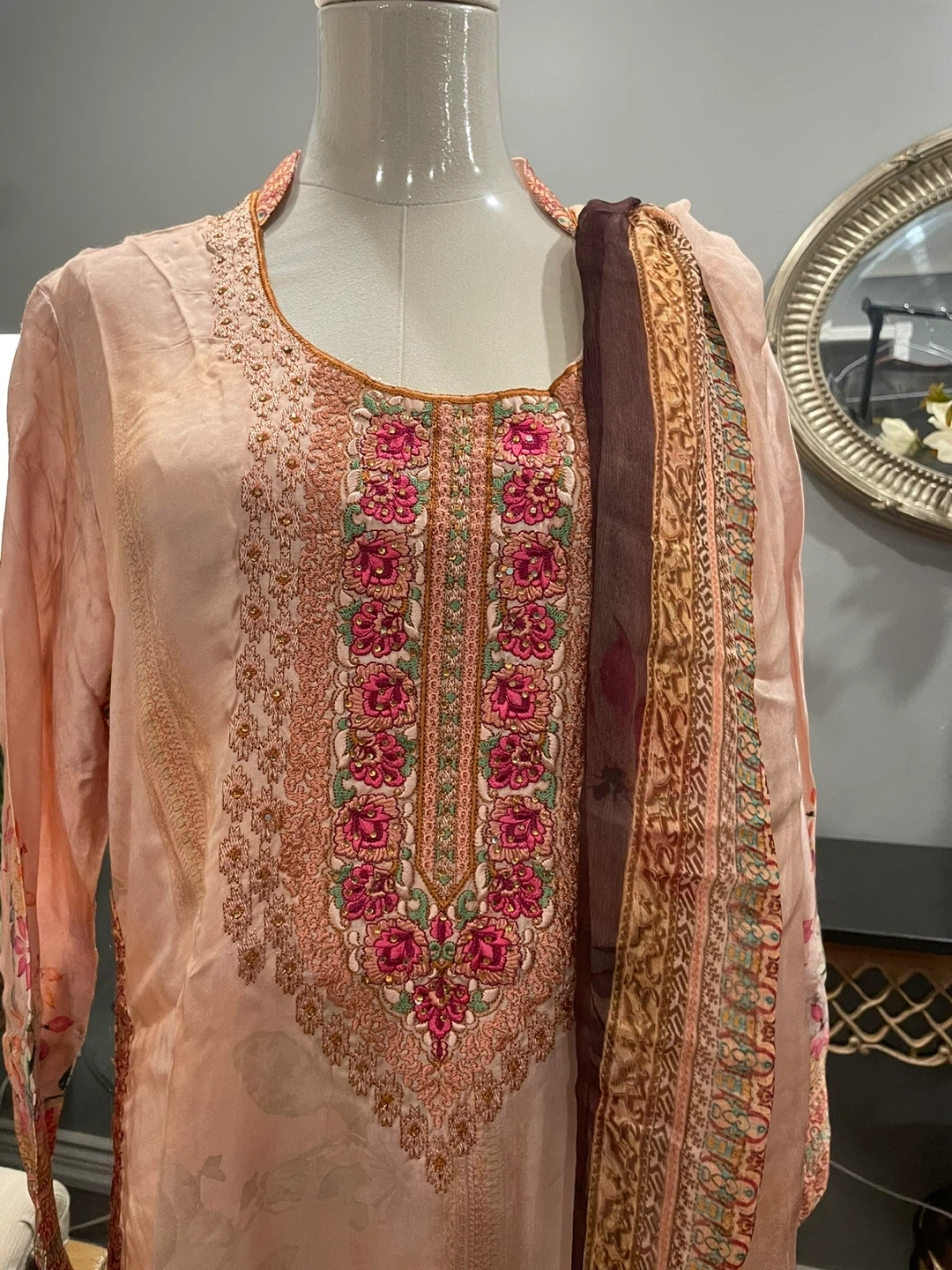 A beautiful women's kurti with intricate embroidery and a matching dupatta. The set features a cream-coloured kurti adorned with floral patterns in pink and orange hues. It's perfect for festive occasions or casual wear. Made from lightweight fabric for comfort.