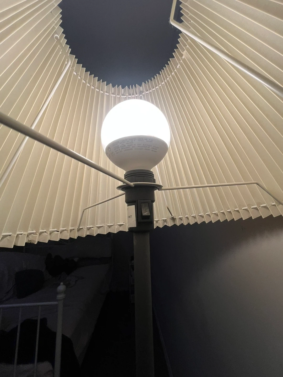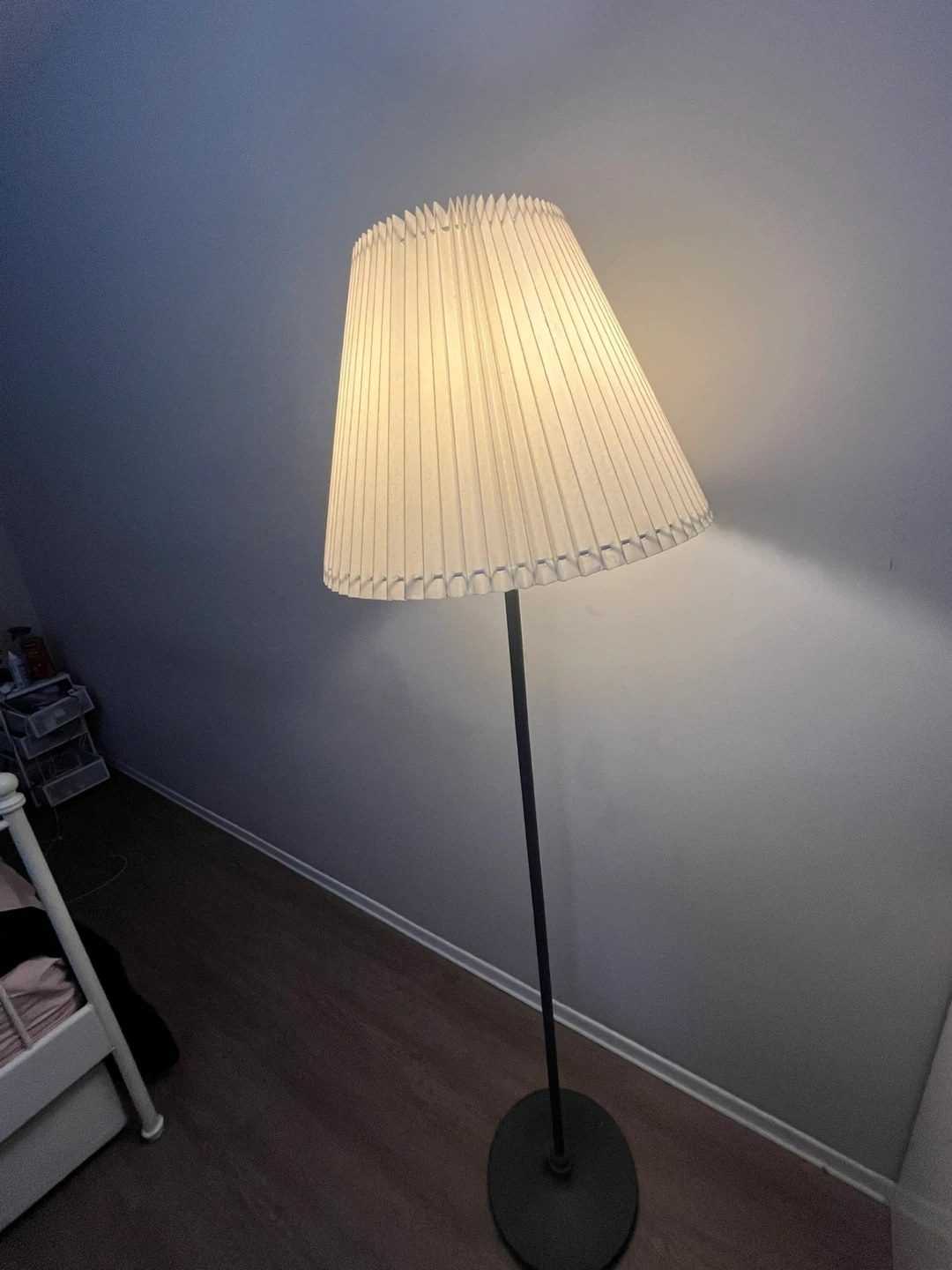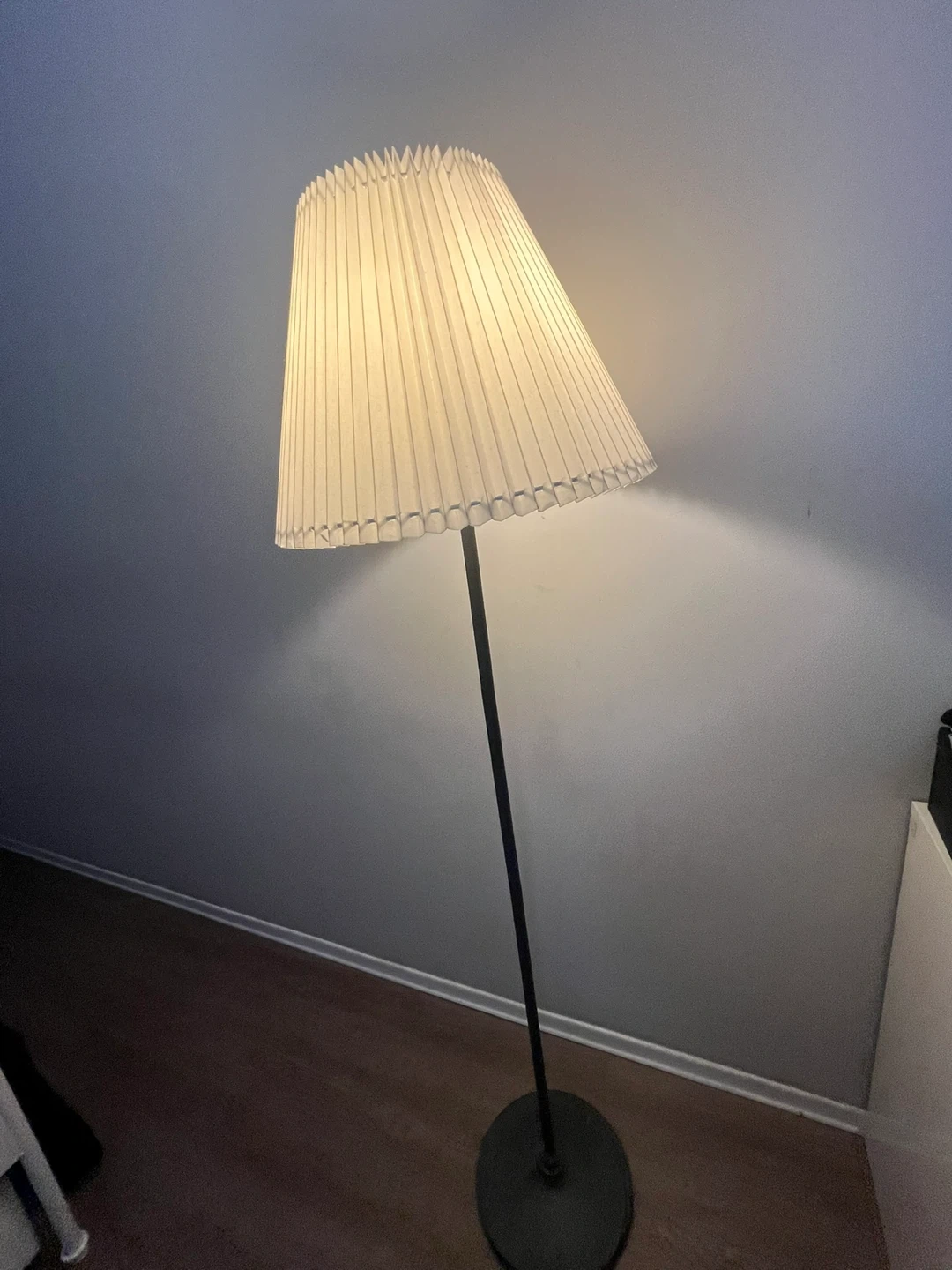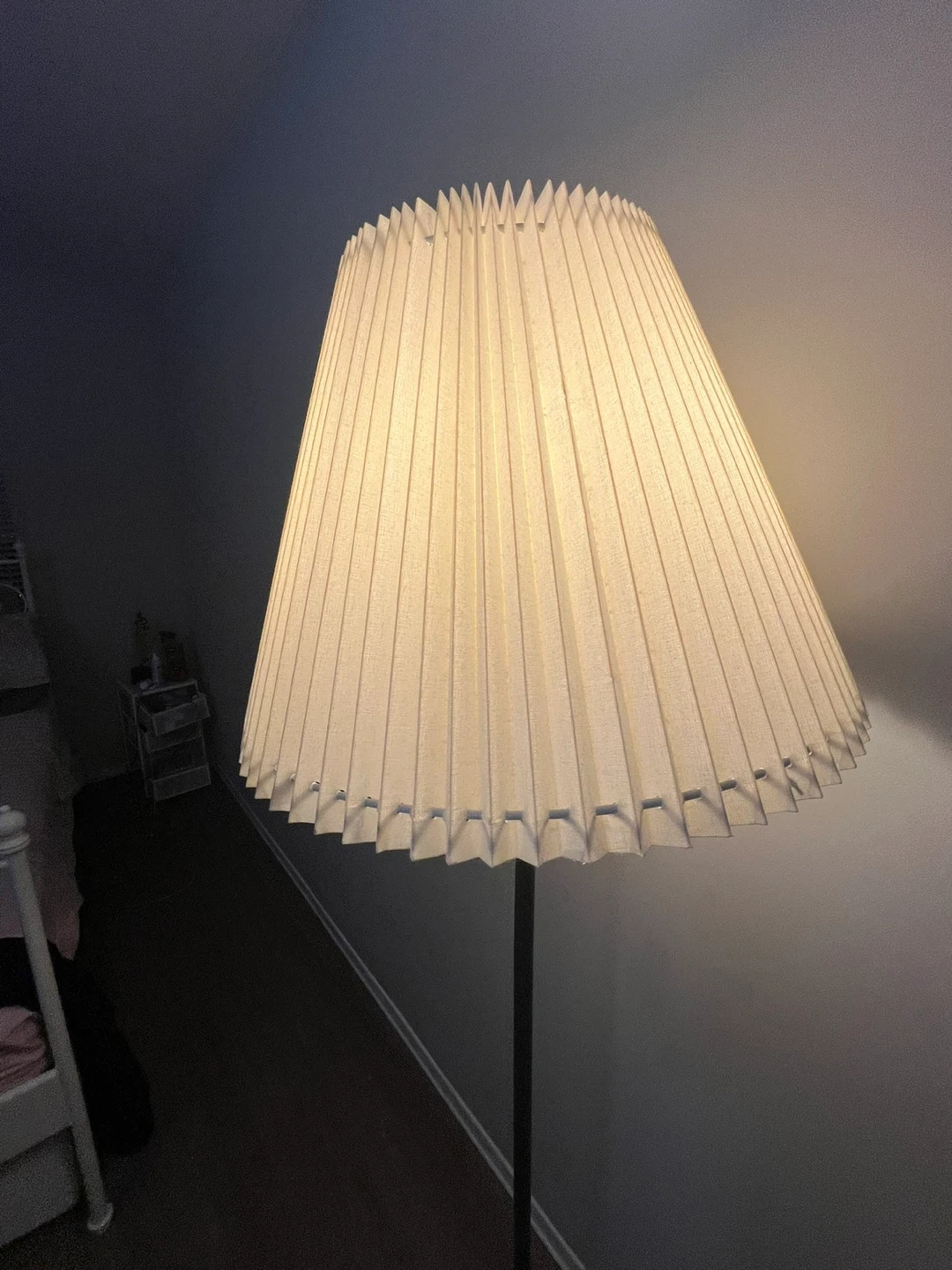 This floor lamp has a unique pleated shade that casts a soft glow. It's operated by a simple switch on the pole. The lamp's base and pole are dark grey metal.