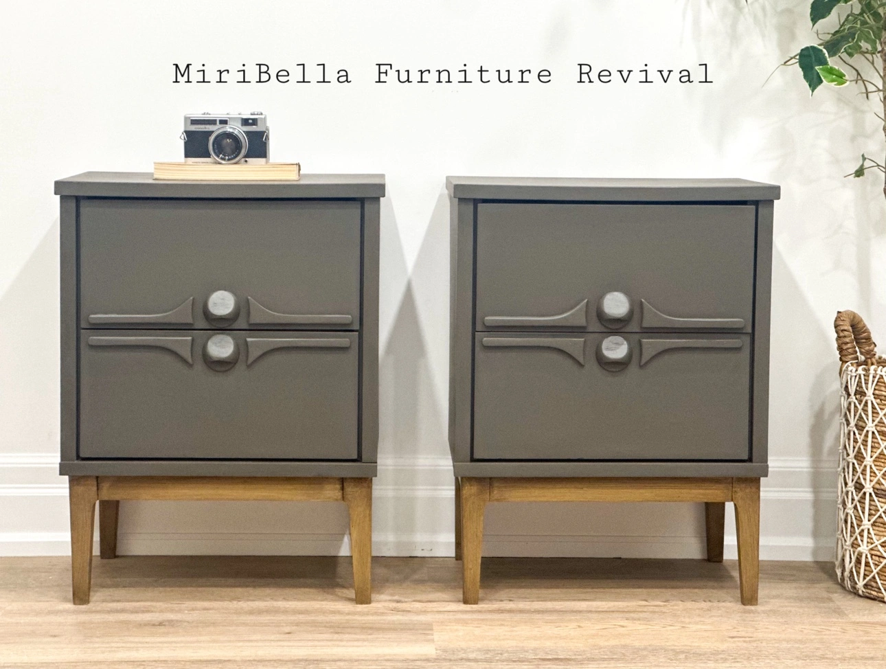 A pair of solid wood mid century modern night tables, painted in a dark grey, accented with wood tone legs. They each feature 2 working drawers.