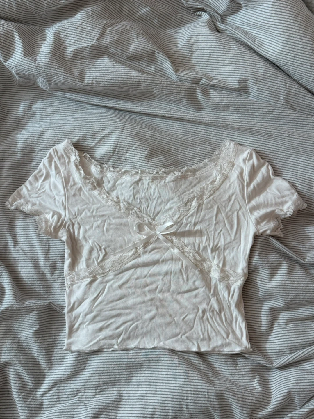 This white cropped top features a delicate lace trim and a sweet ribbon tie detail at the front. It's made from a soft, stretchy fabric, perfect for layering or wearing on its own. A charming addition to any casual outfit!