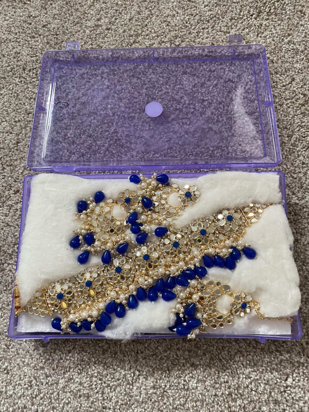 Beautiful bridal-style jewellery set. Features blue and gold accents, pearls, and mirror work. Includes necklace, earrings, and maang tikka.