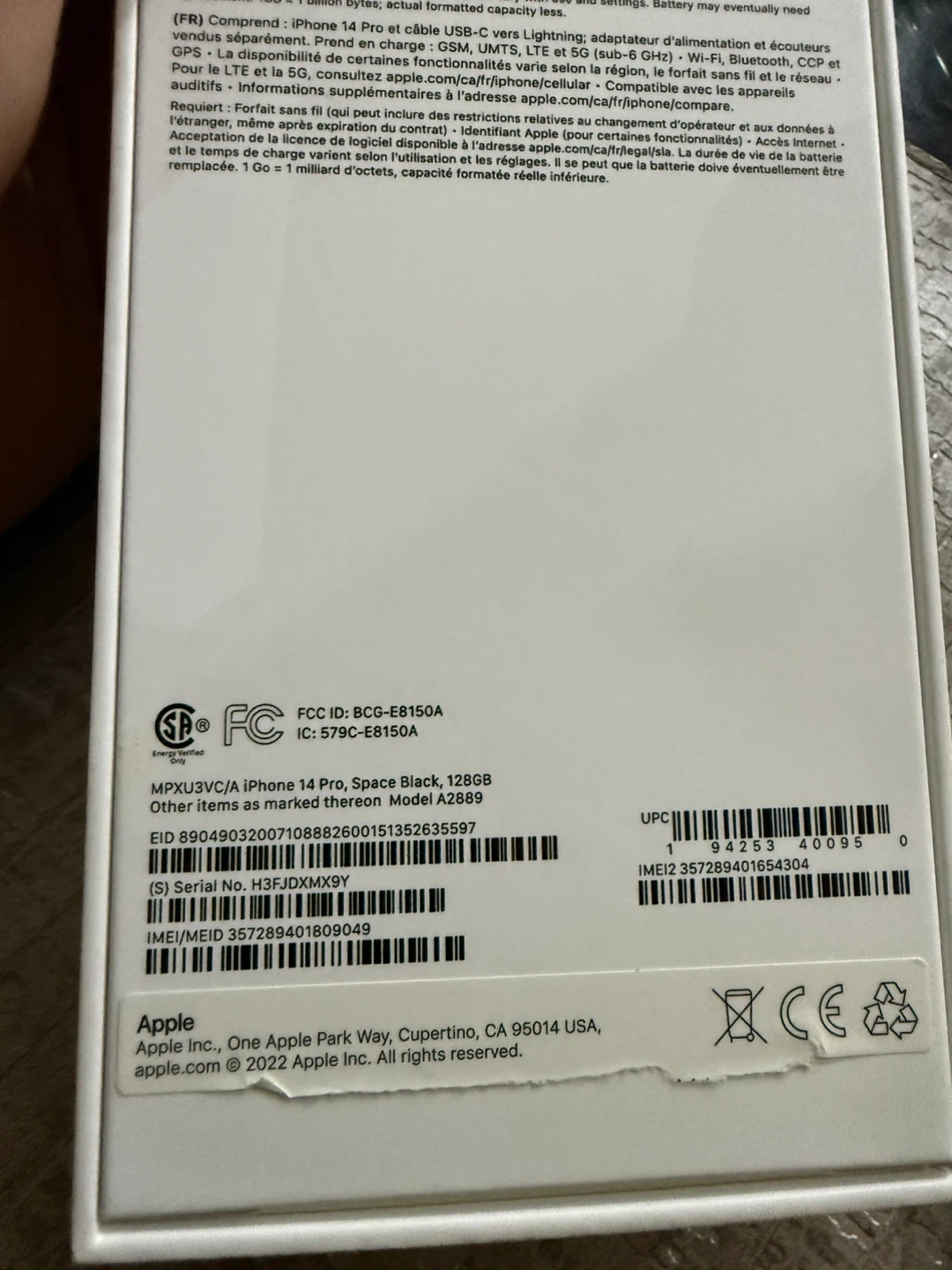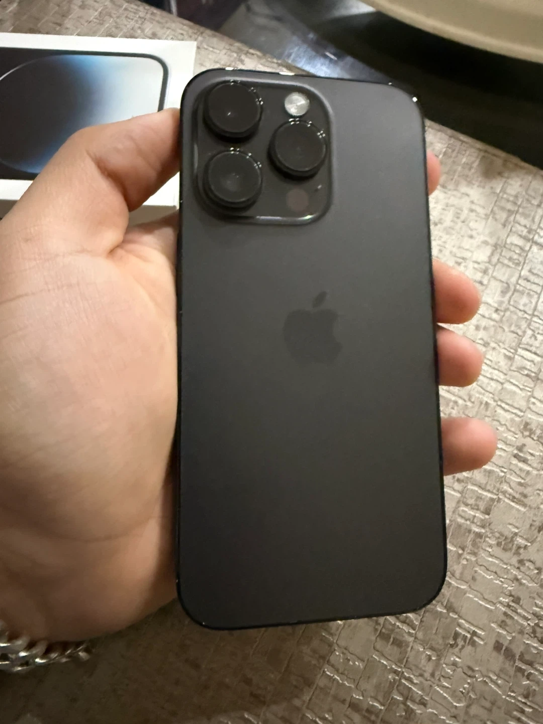 Apple iPhone 14 Pro in Space Black. This phone comes with a USB-C to Lightning cable. It's designed by Apple in California and includes original packaging.