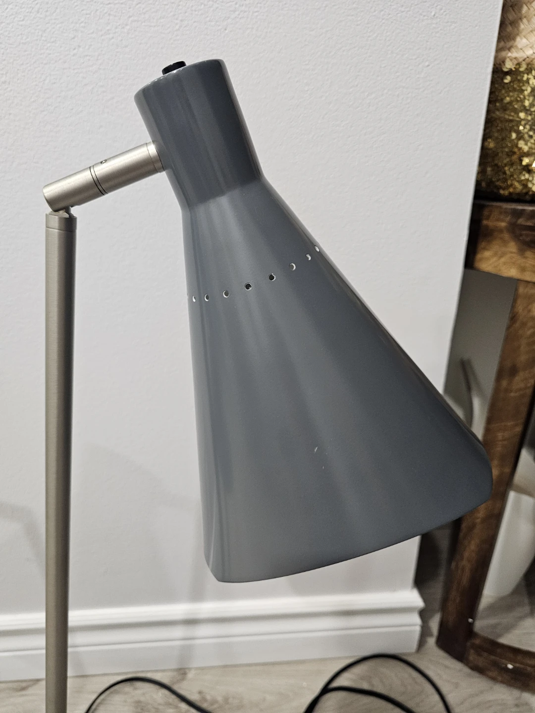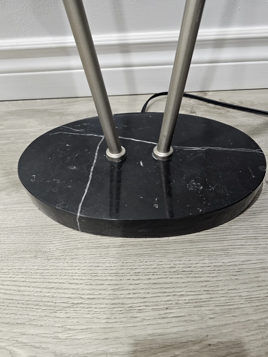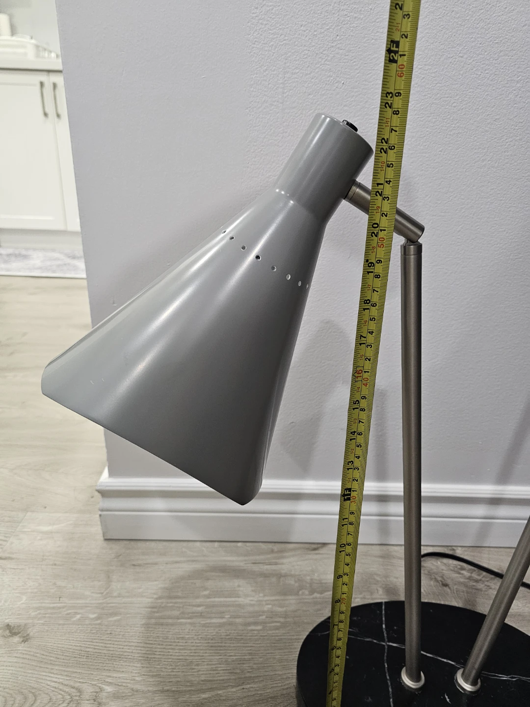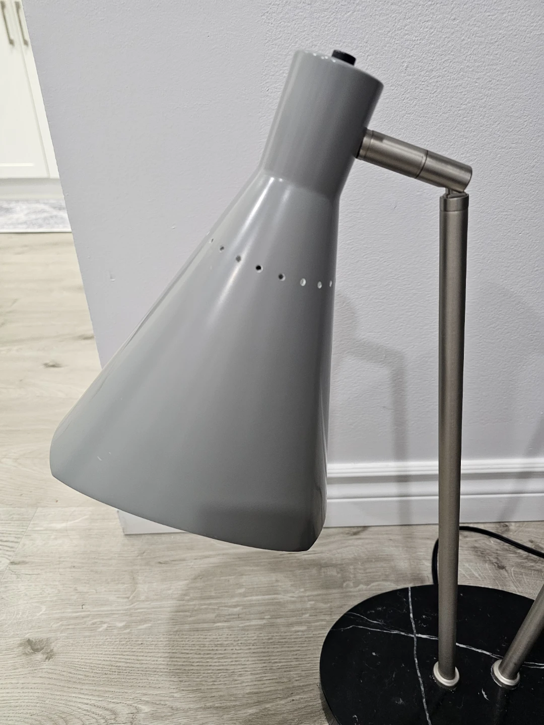 This is a stylish double-head desk lamp. It has a grey finish on the lampshades and a black marble base. The flexible arms allow for adjustable lighting positions. It's great for illuminating workspaces or reading areas.