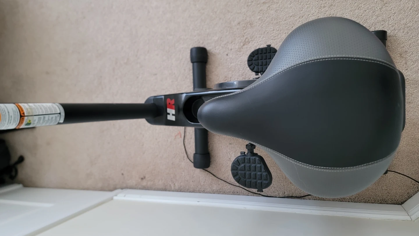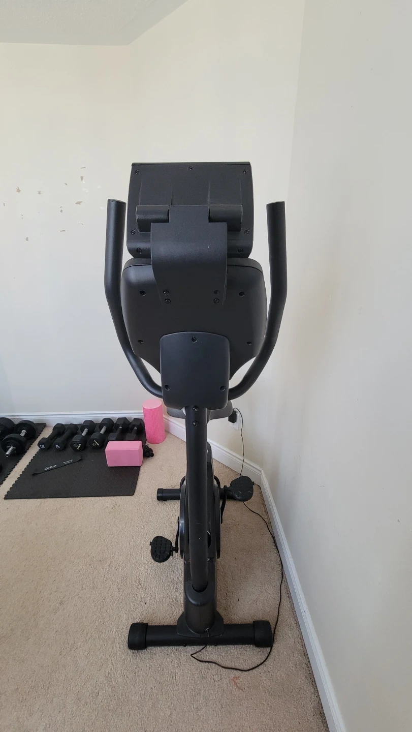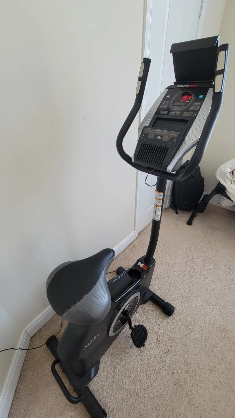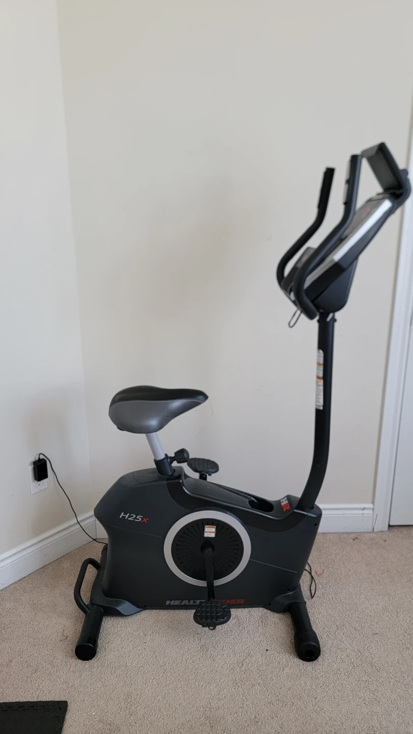 This is a HEALTHRIDER H25X exercise bike. It features a digital display for tracking workouts. It has a comfortable padded seat and adjustable handlebars for a custom fit.