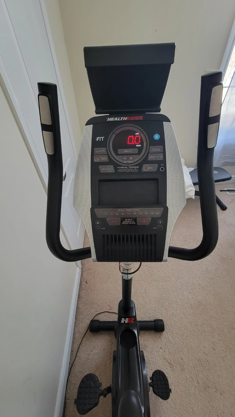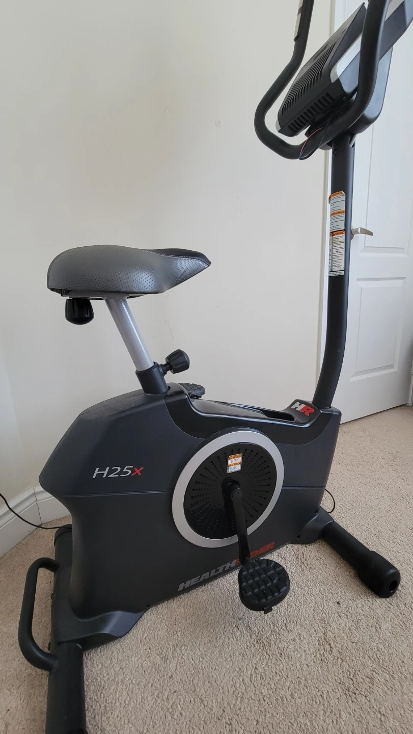 This is a HEALTHRIDER H25X exercise bike. It features a digital display for tracking workouts. It has a comfortable padded seat and adjustable handlebars for a custom fit.