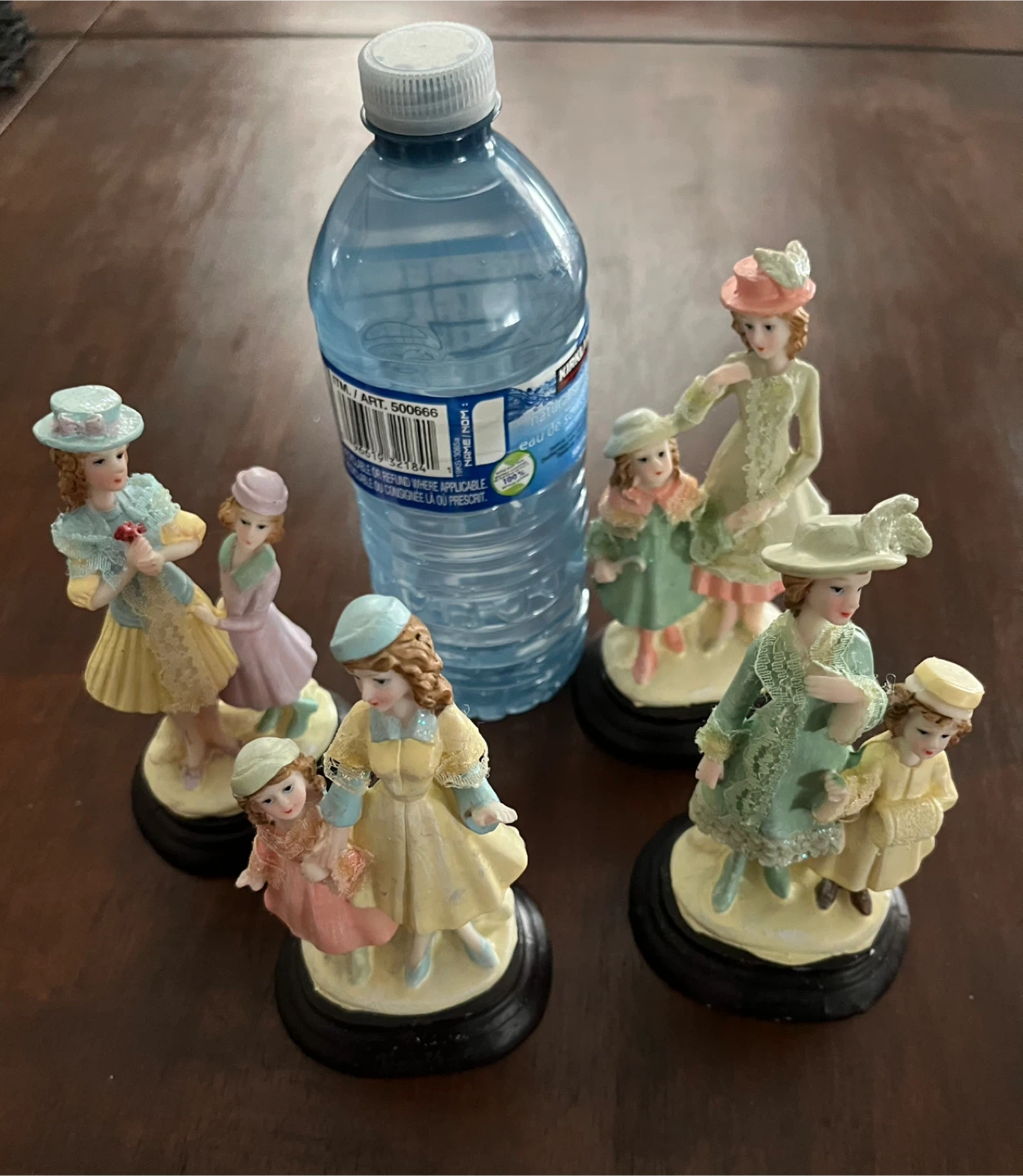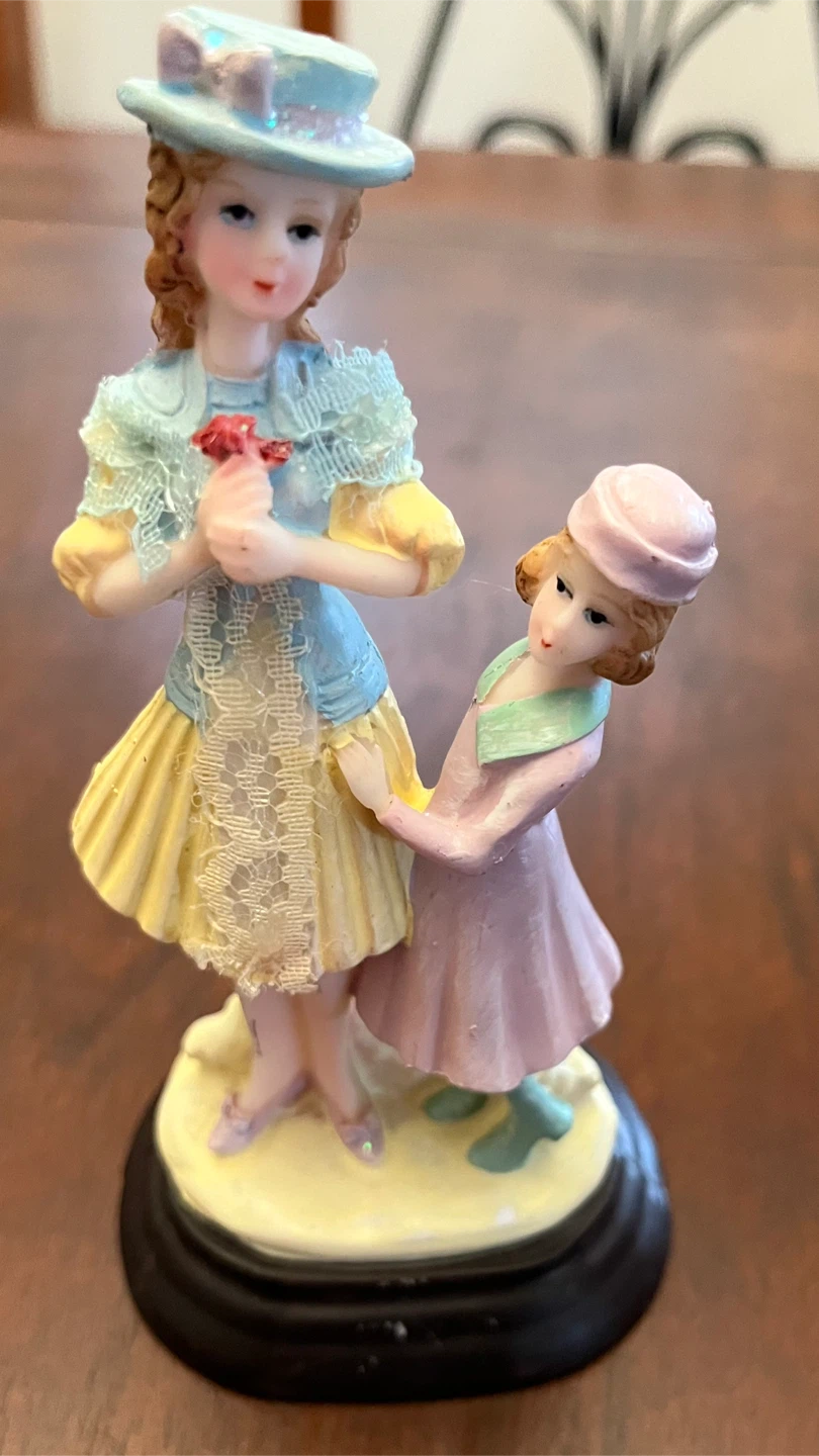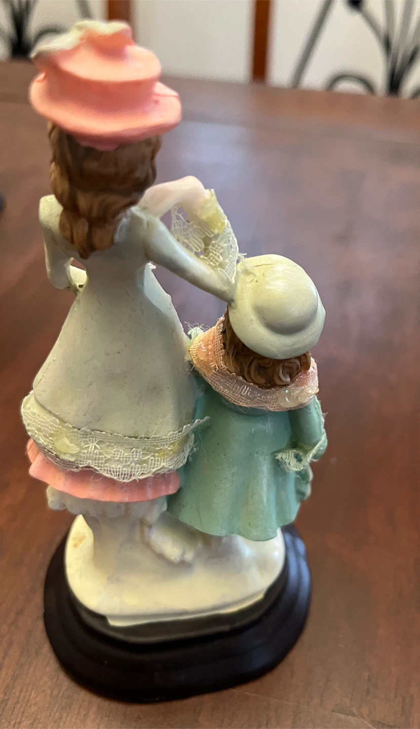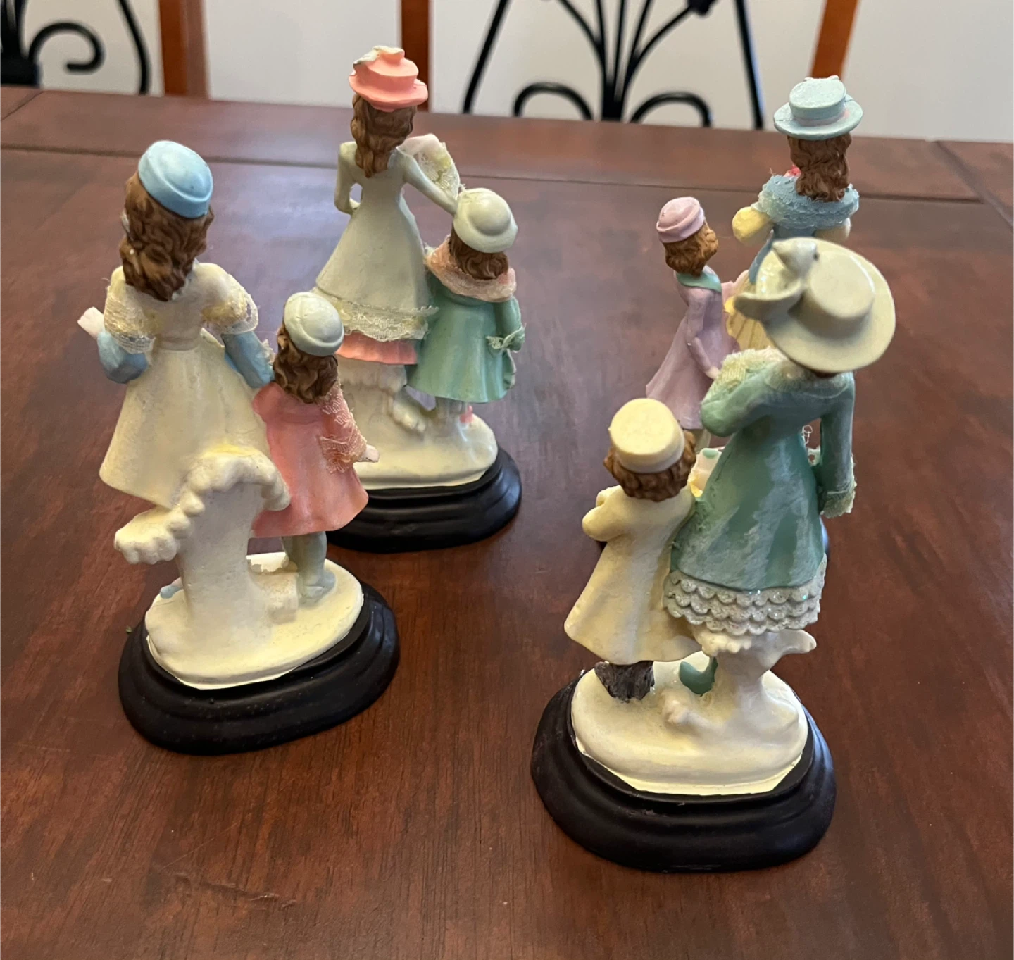 This charming set includes 4 vintage-style figurines of women and children in ornate dresses and hats. Each figurine is mounted on a black base.