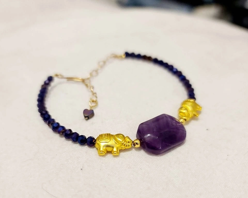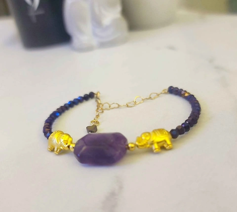 Amethyst is 3/4" X 1/2". Crystals are a deep purple/black, elephants are golden. Bracelet size is adjustable using the golden heart chain and clasp and is created using memory wire.