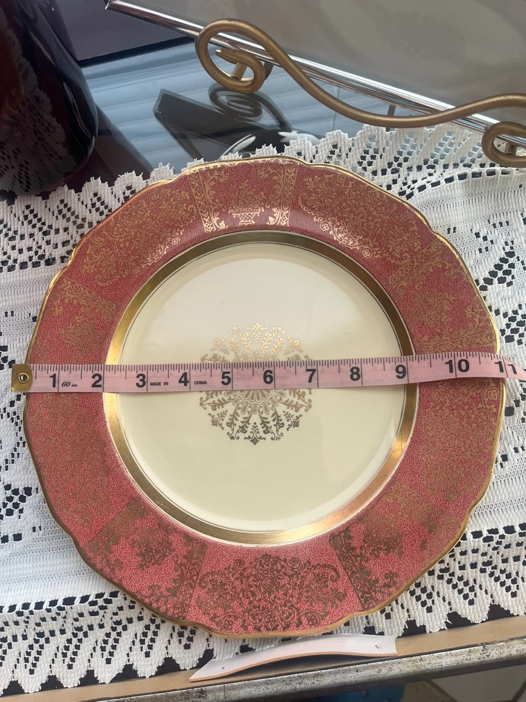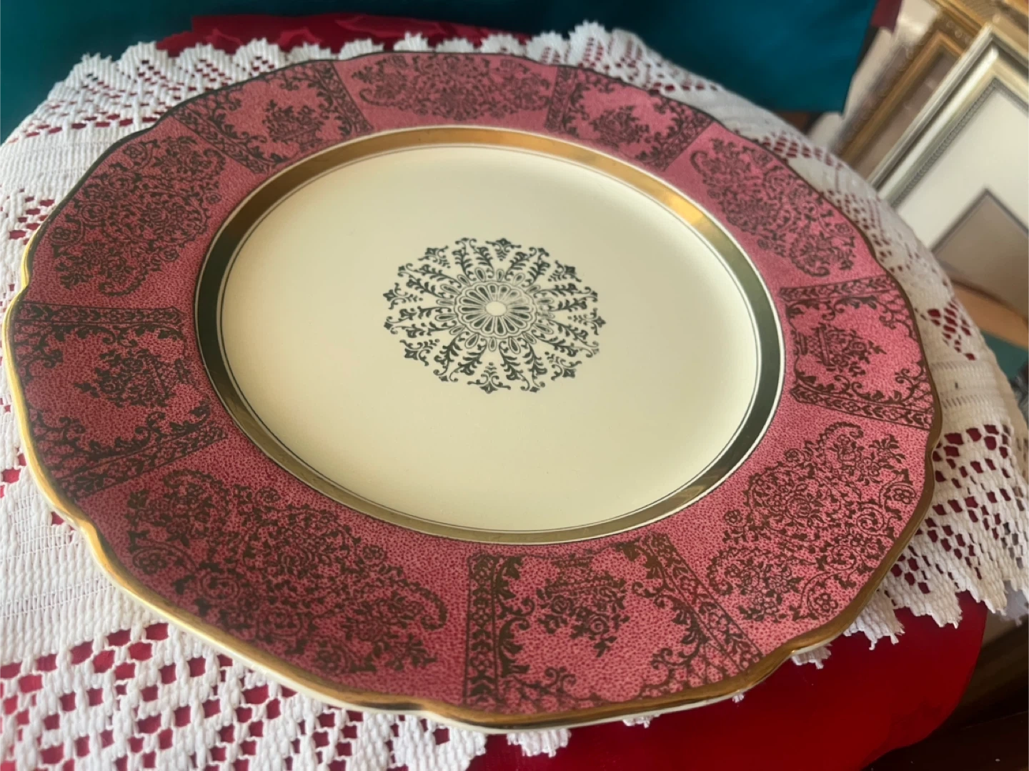 A vintage charger plate from Johnson Brothers, England. It features a decorative pink band with gold accents and a central floral style design.