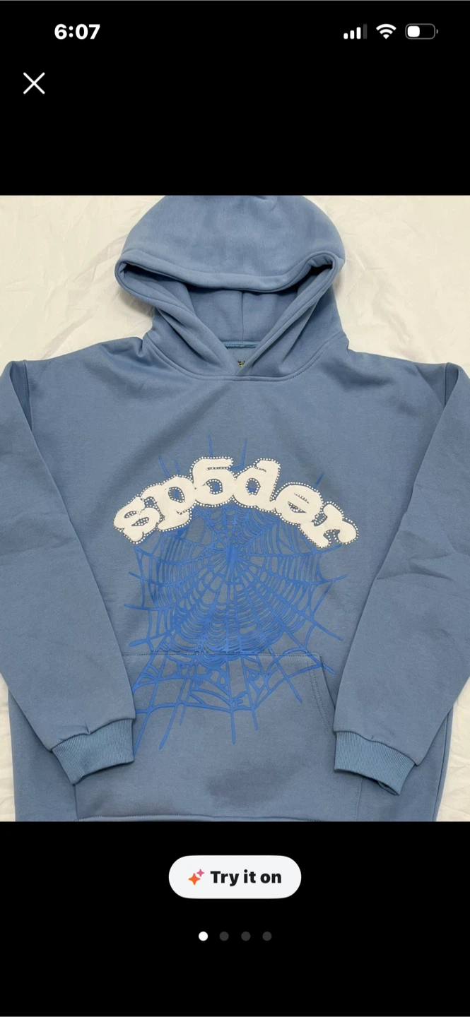 Selling a blue Spider hoodie with a spiderweb design. The word "Spider" is written in a unique, textured font, outlined with rhinestones. It's a stylish piece for any wardrobe!