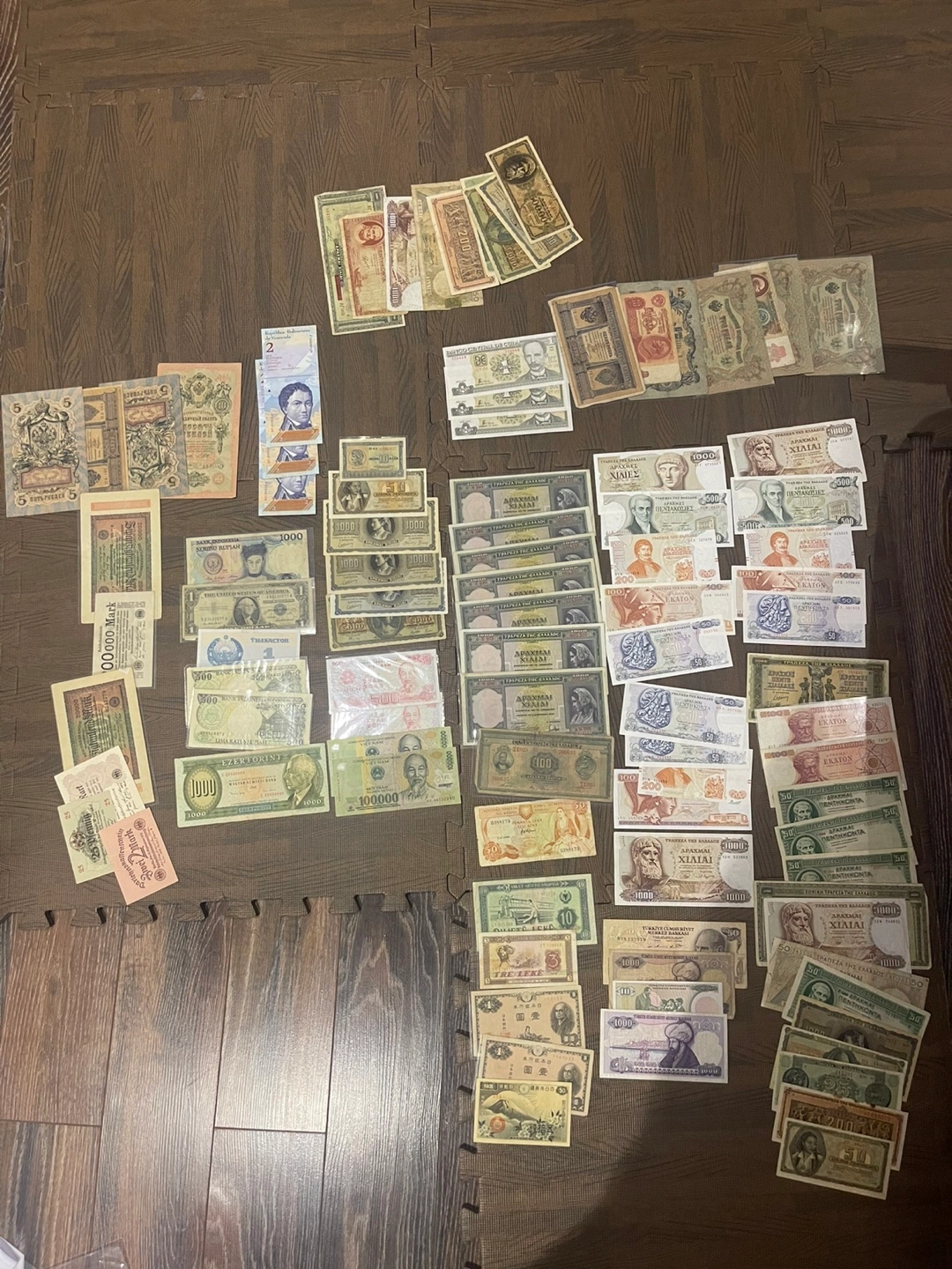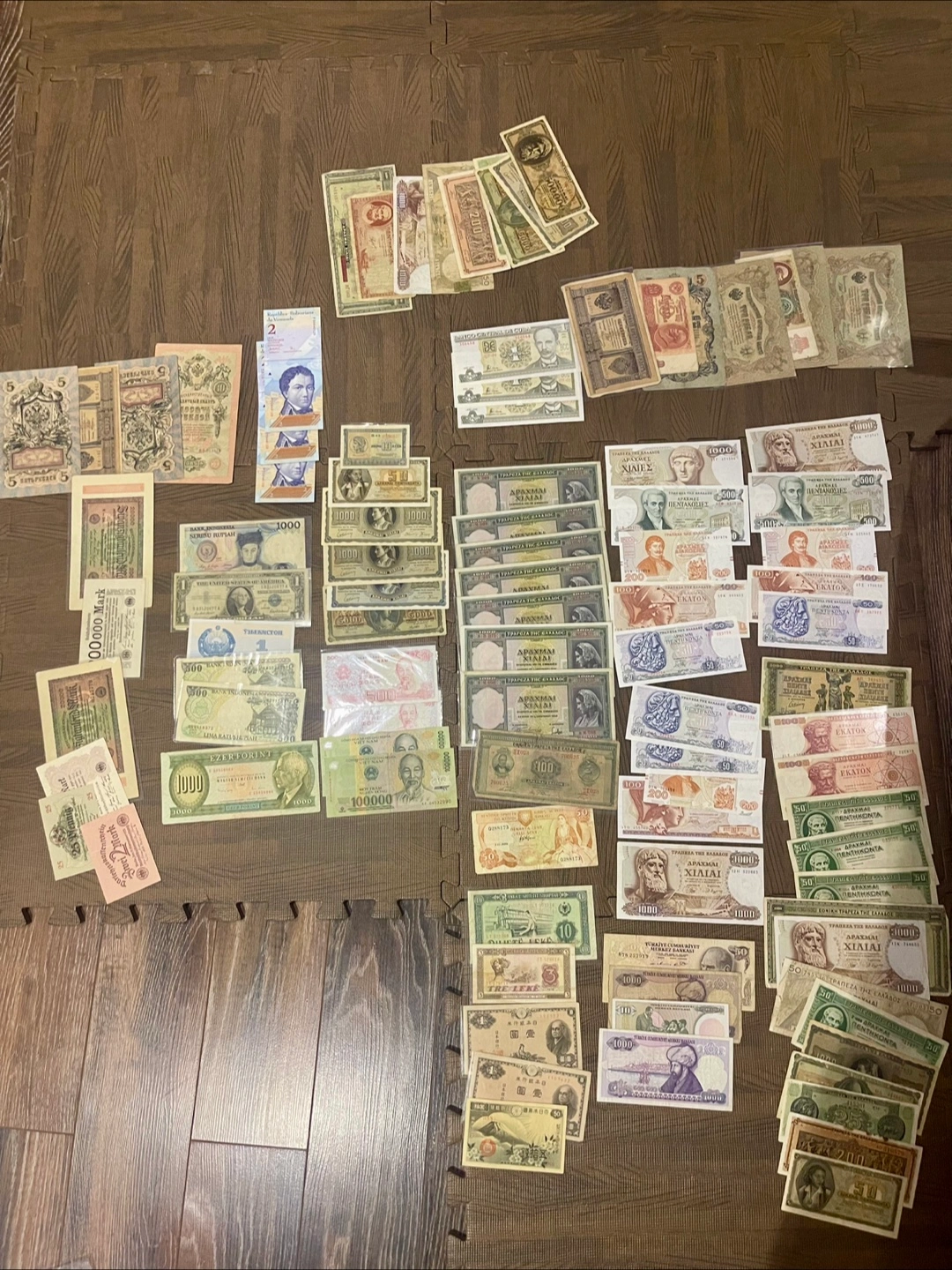 Here's a collection of various world banknotes. The collection includes banknotes from different countries and denominations. Great for collectors or anyone interested in currency!
