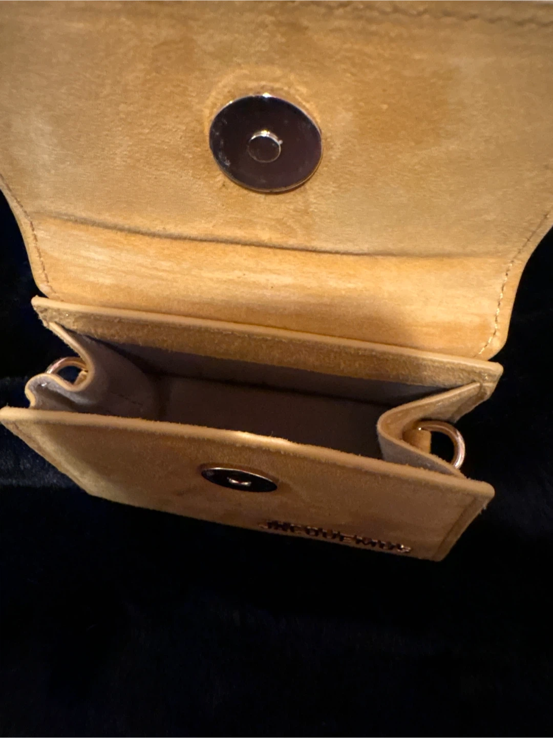 This is a tan suede mini bag by Jacquemus. It features a top handle and a magnetic snap closure. Perfect for carrying small essentials! The only thing I don’t have the strap.