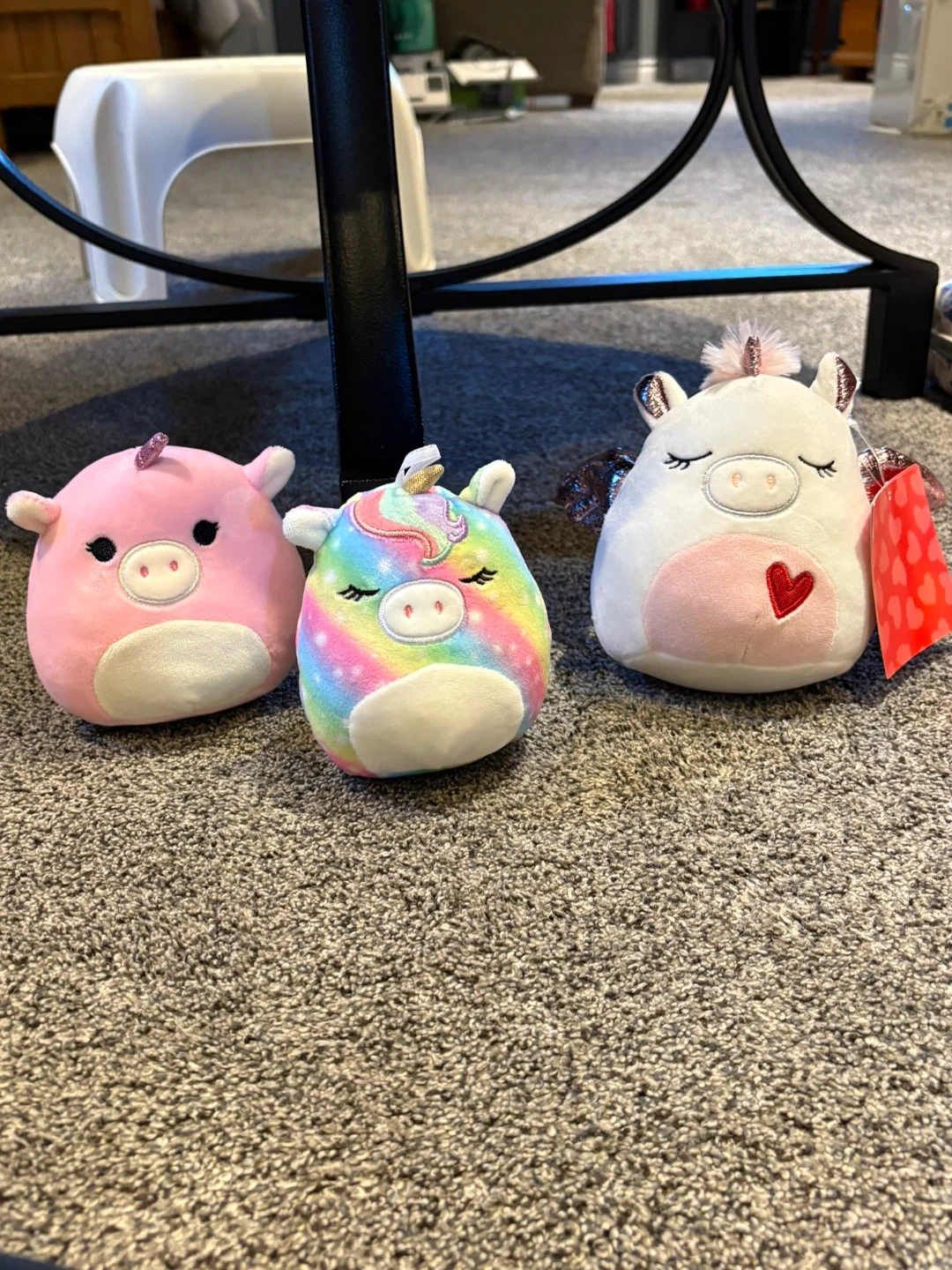 This is a set of three Squishmallows plush toys. It includes a pink pig unicorn, a rainbow unicorn, and a white unicorn with wings.