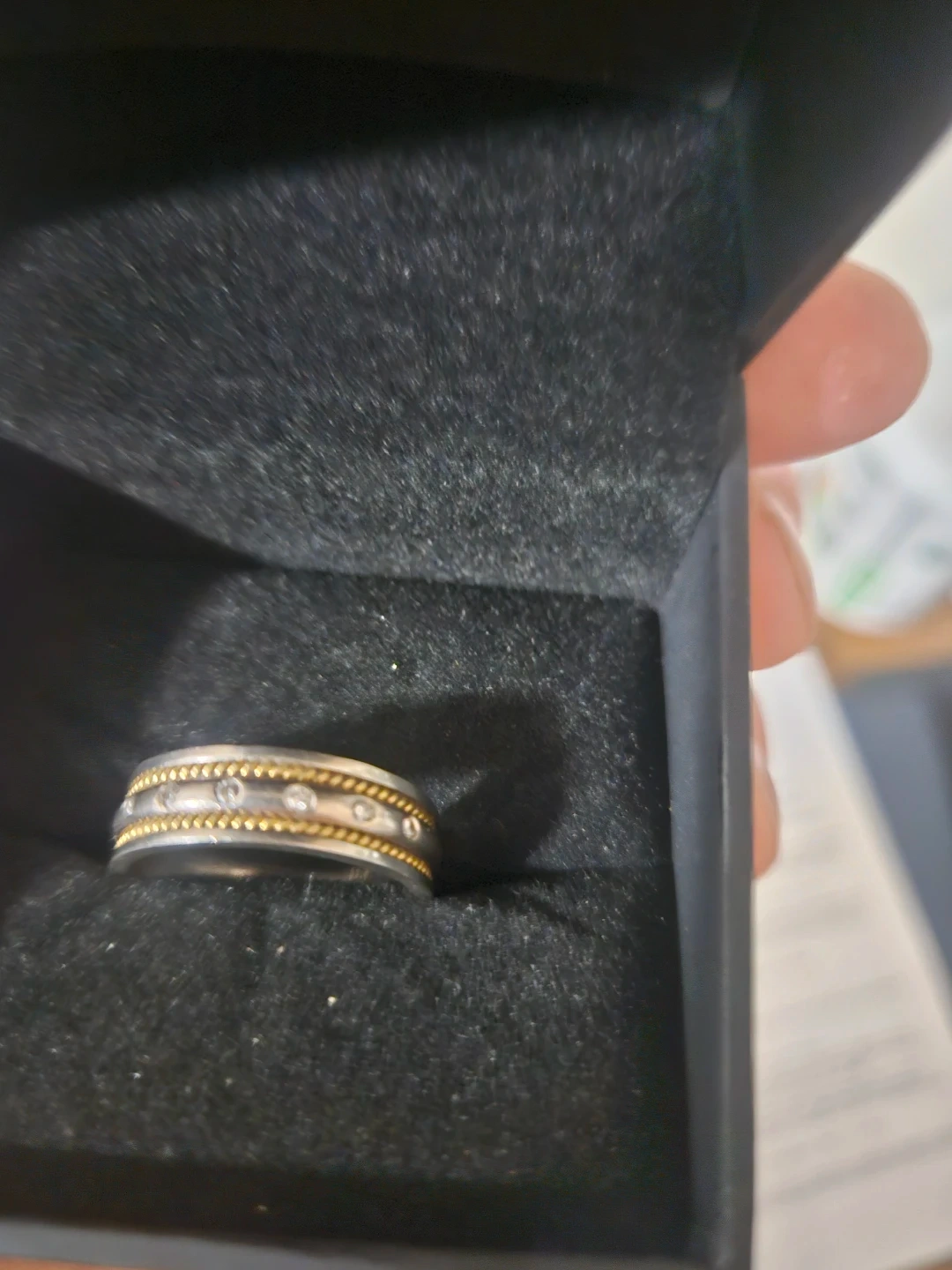 This wedding ring is 18K white and yellow Gold with 7 Round full cut diamonds.