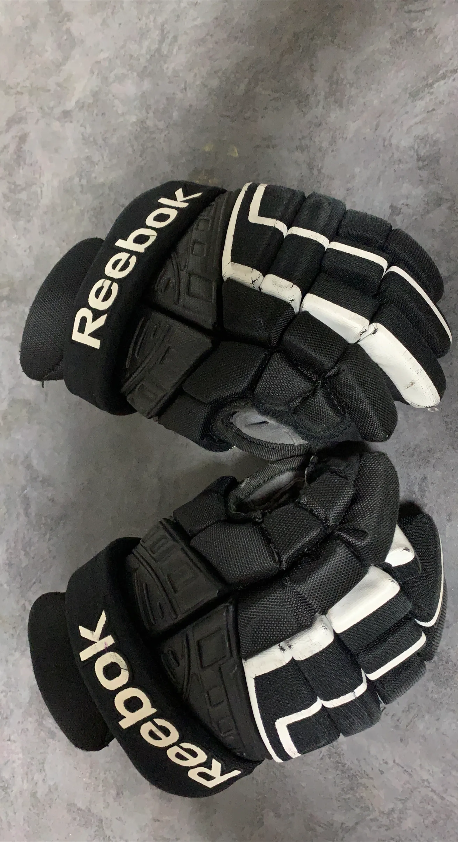 Selling a pair of Reebok hockey gloves in black and white. They show some signs of wear, but still have lots of life left for your games on the ice!