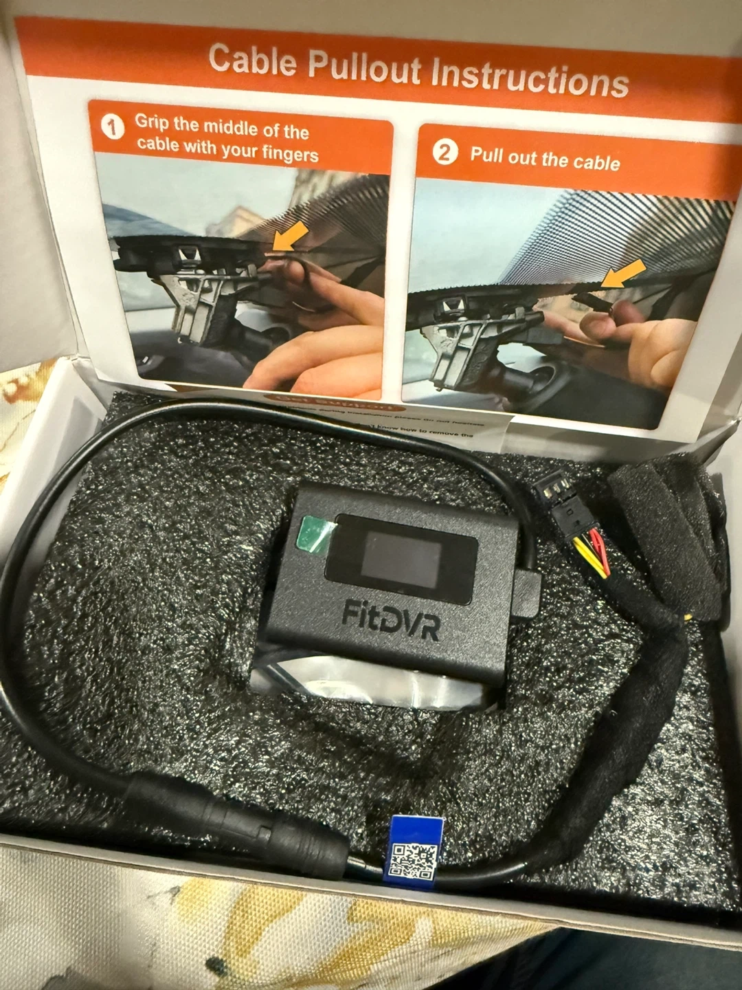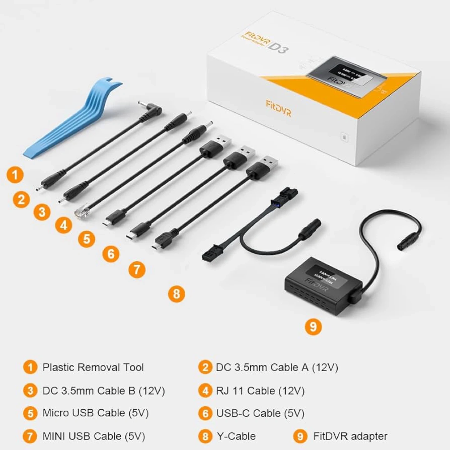 This FitDVR adapter provides power for your dash cam and other accessories. It has a USB output for 5V and a DC 3.5mm output for 12V. It connects to your car's rain sensor plug for power, and also has a connector for the rearview mirror plug. Includes a USB cable, DC 3.5mm cable, and Y-cable.