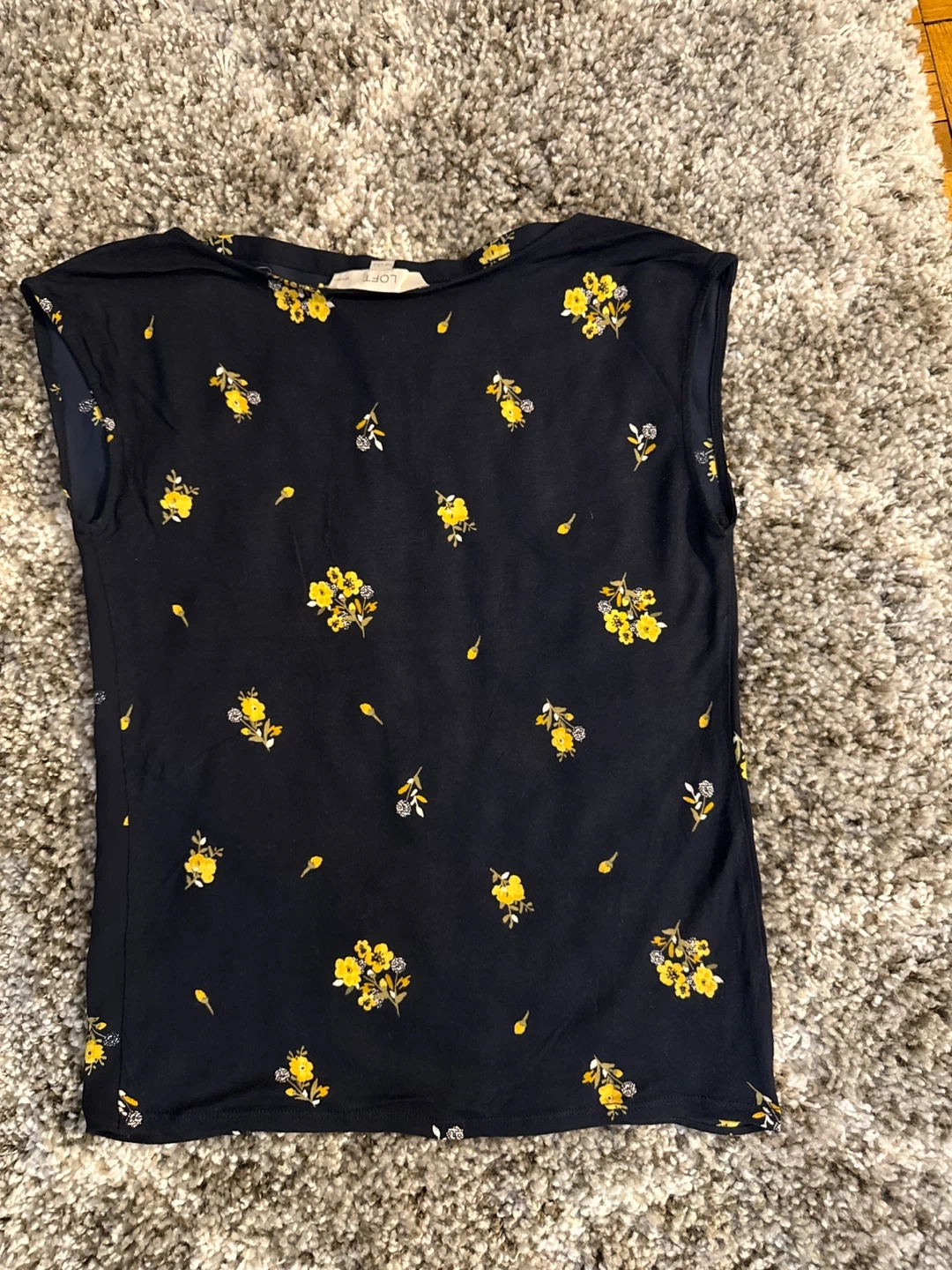 This Loft top features a navy background with a yellow floral print. It's a sleeveless style with a round neckline. Made in Vietnam.