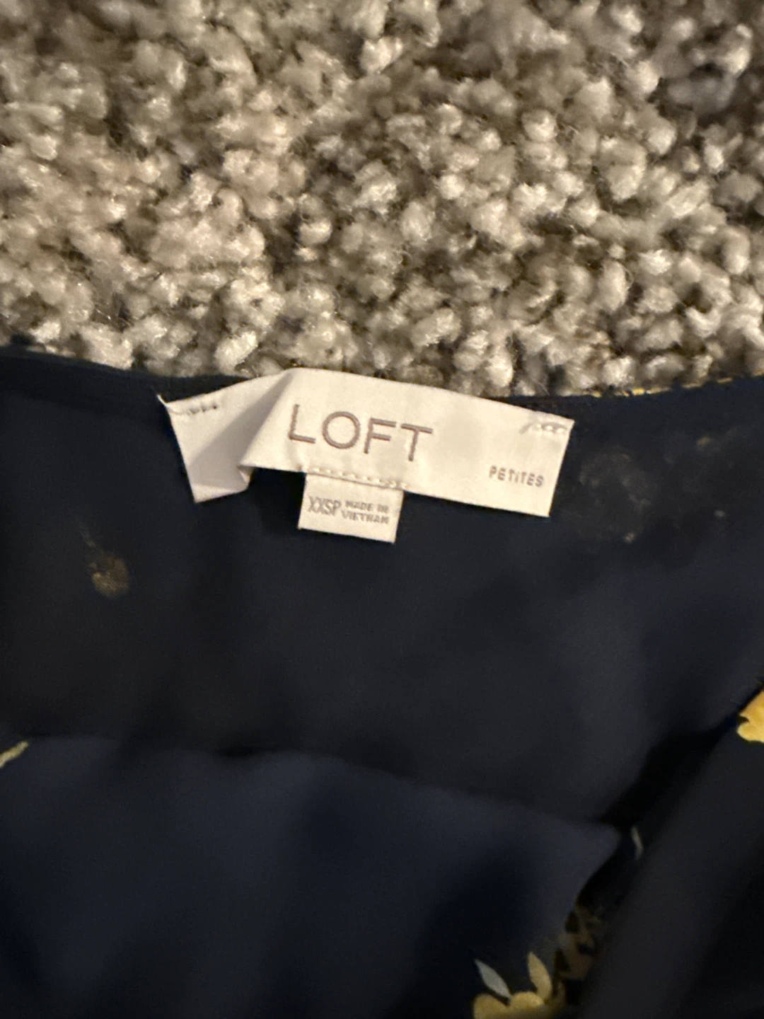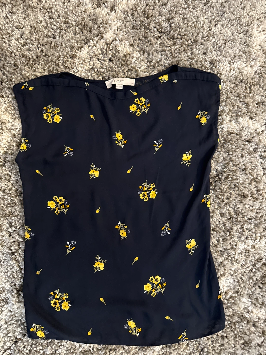 This Loft top features a navy background with a yellow floral print. It's a sleeveless style with a round neckline. Made in Vietnam.