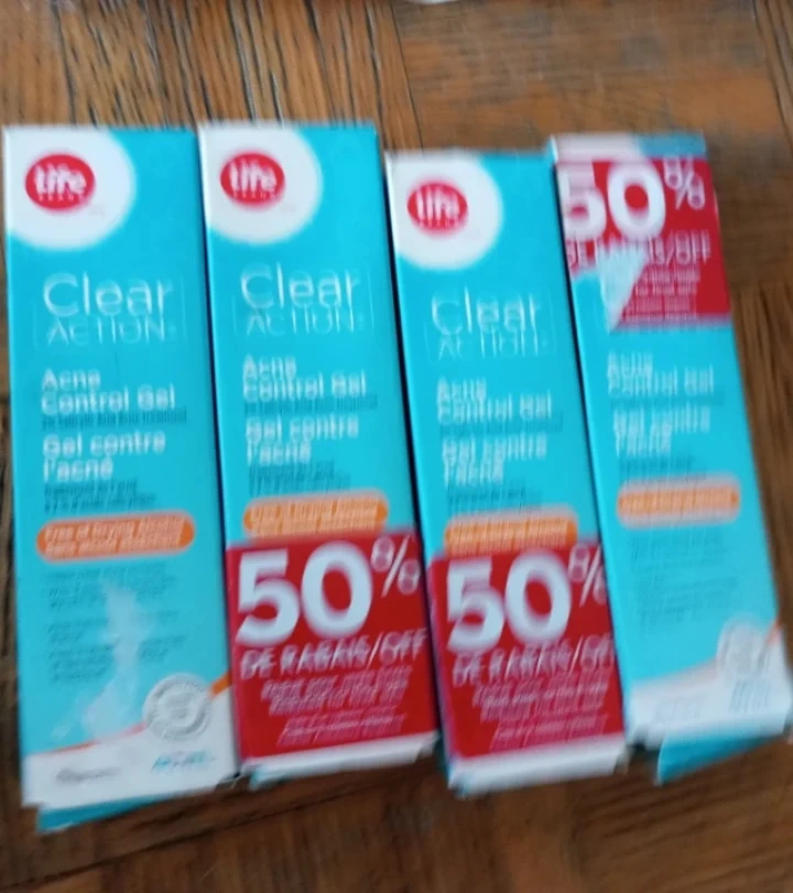 Four tubes of Life Brand Clear Action Acne Control Gel.