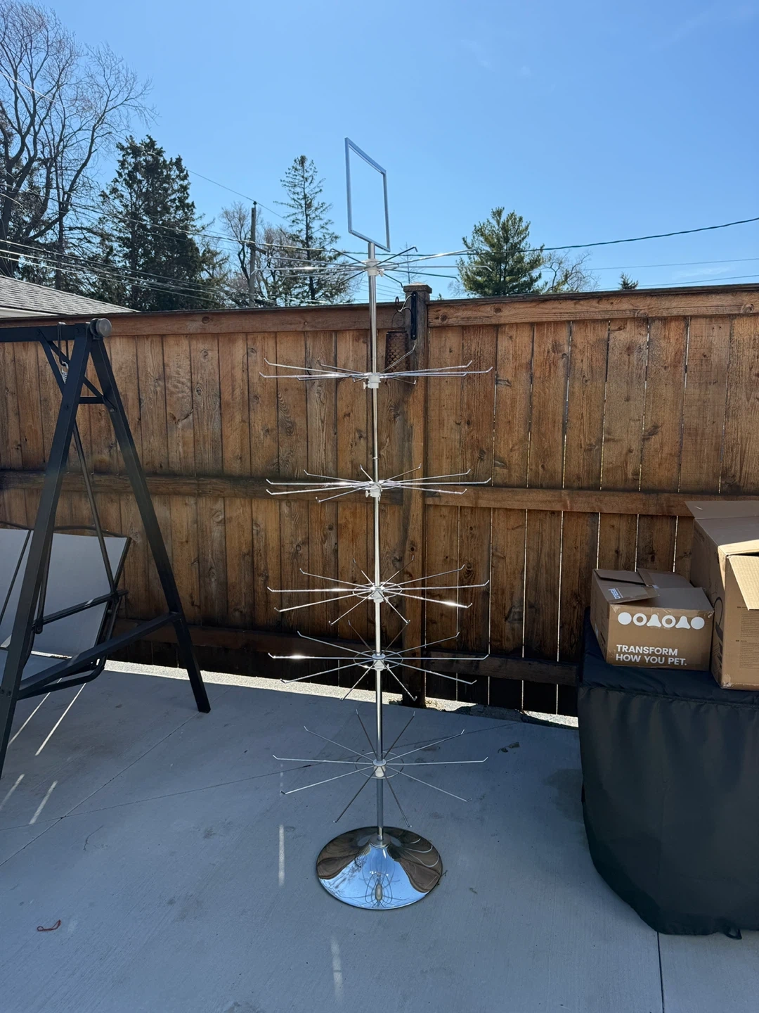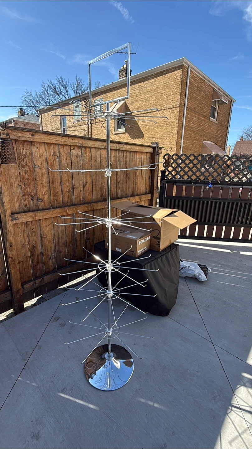 This is a multi-tiered rotating display stand. It features multiple adjustable rotating hooks on each level for hanging items. Great for organizing and showcasing merchandise and craft shows!
