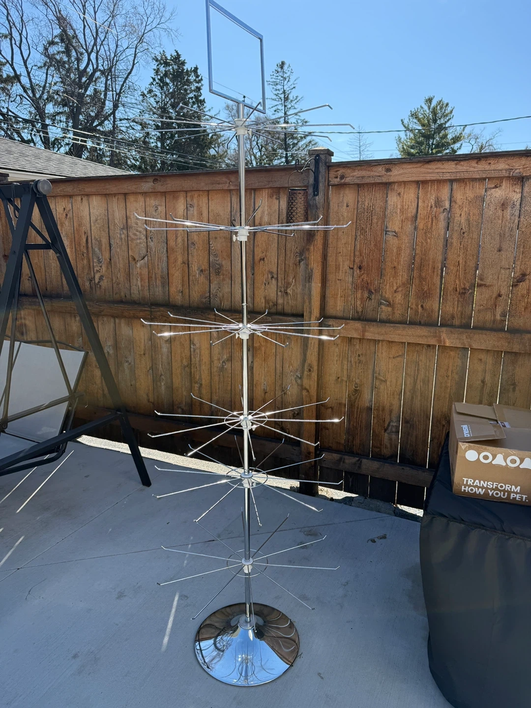 This is a multi-tiered rotating display stand. It features multiple adjustable rotating hooks on each level for hanging items. Great for organizing and showcasing merchandise and craft shows!