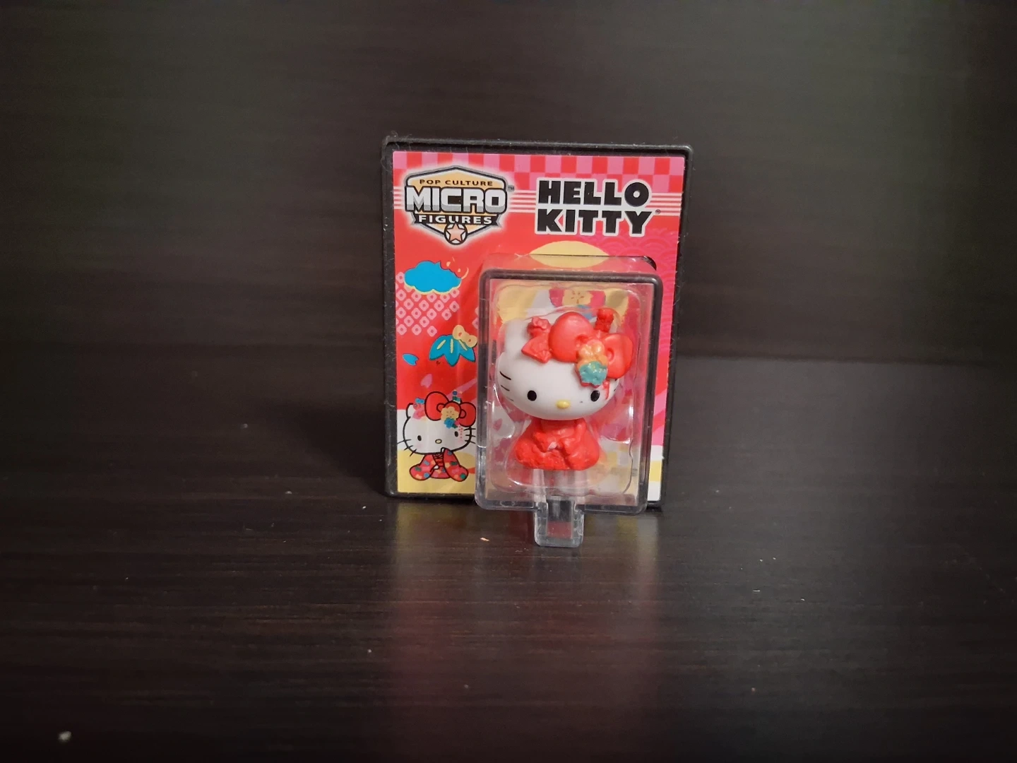 This is a Hello Kitty Micro Figure, from the Pop Culture line. It comes in its original packaging, showing a detailed design. This figure is made of plastic.